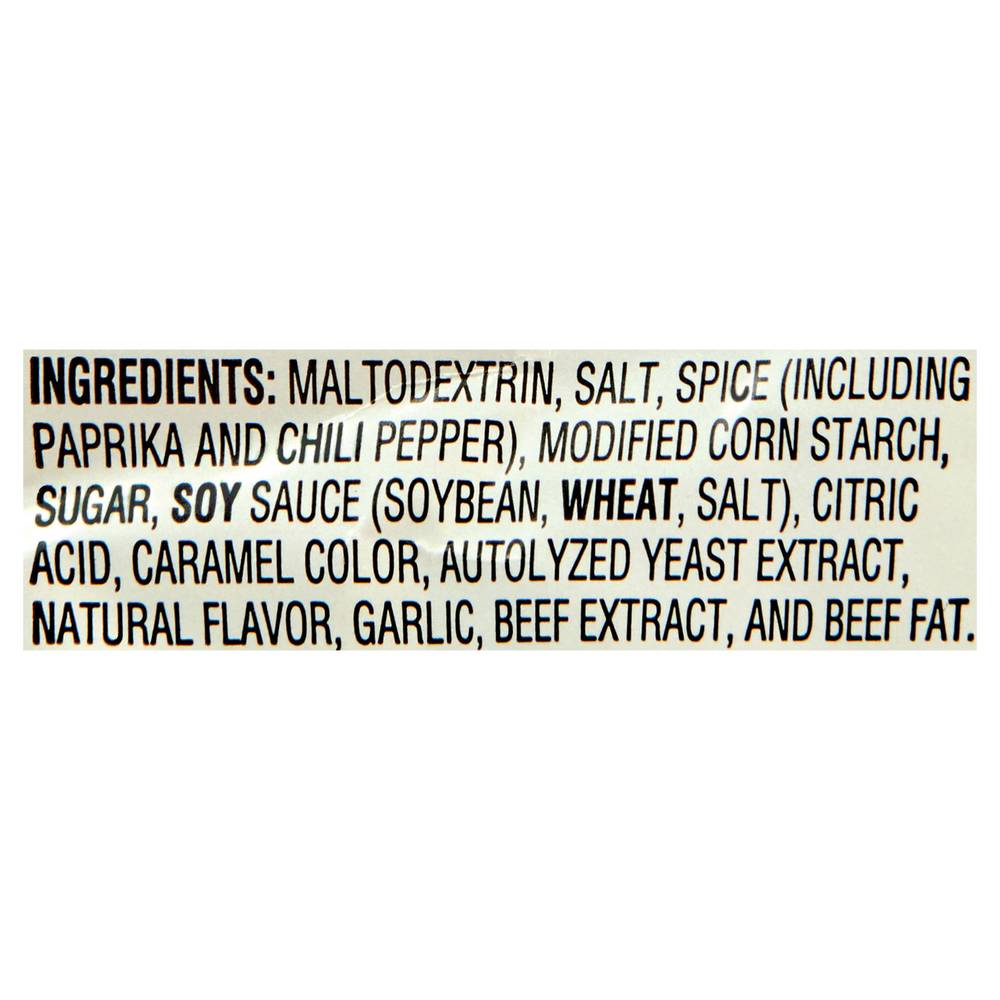 Ingredients: Maltodextrin, Salt, Spice (Including Paprika and Chili Pepper), Modified Corn Starch, Sugar, Soy Sauce (Soybean, Wheat, Salt), Citric Acid, Caramel Color, Autolyzed Yeast Extract, Natural Flavor, Garlic, Beef Extract, and Beef Fat. Contains: wheat, soy