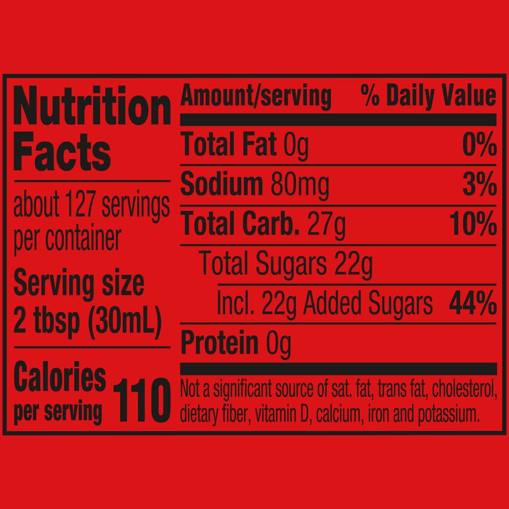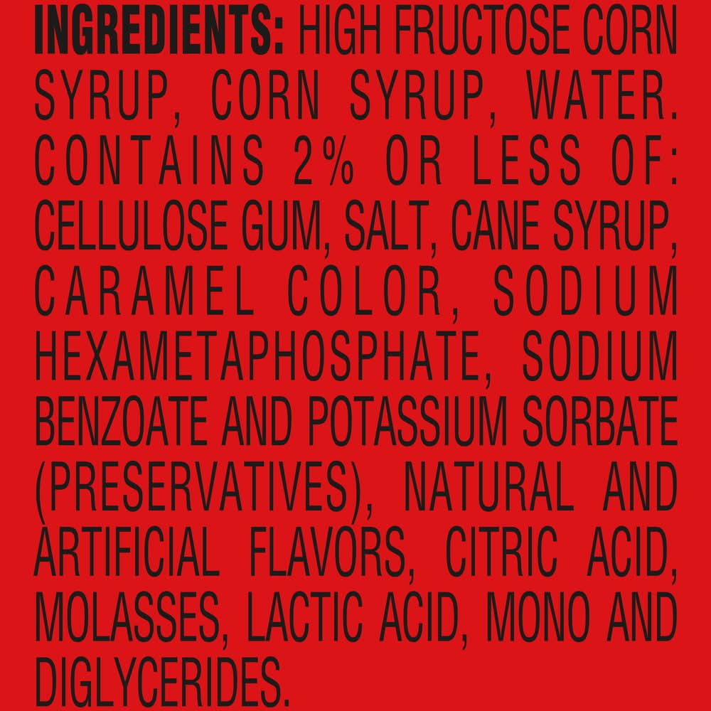 Ingredients: INGREDIENTS: HIGH FRUCTOSE CORN SYRUP, CORN SYRUP, WATER. CONTAINS 2% OR LESS OF: CELLULOSE GUM, SALT, CANE SYRUP, CARAMEL COLOR, SODIUM HEXAMETAPHOSPHATE, SODIUM BENZOATE AND POTASSIUM SORBATE (PRESERVATIVES), NATURAL AND ARTIFICIAL FLAVORS, CITRIC ACID, MOLASSES, LACTIC ACID, MONO AND DIGLYCERIDES.
