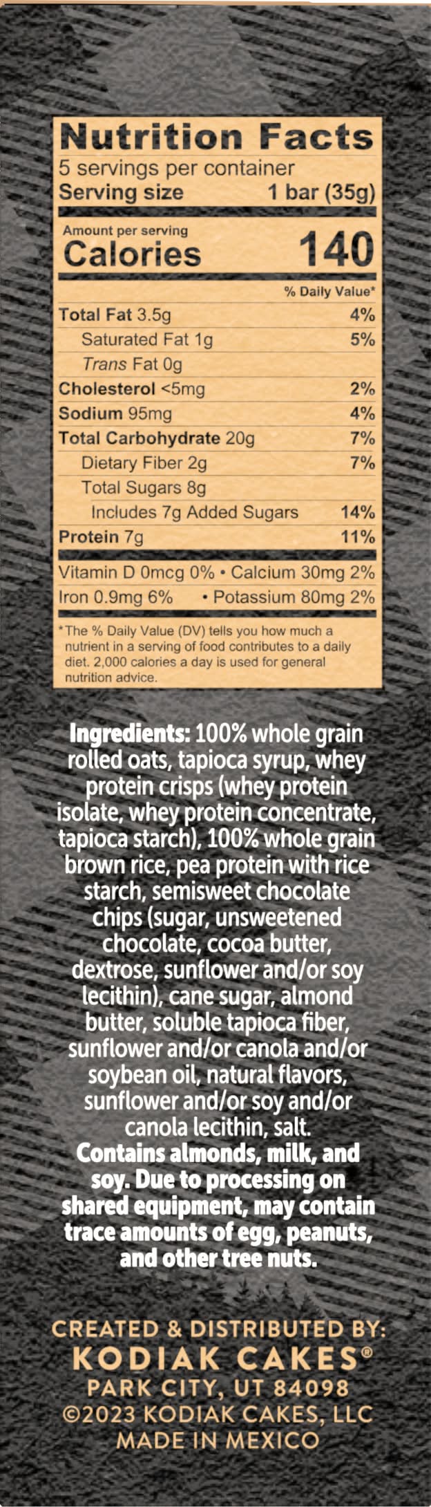 Ingredients: 100% Whole Grain Rolled Oats, Tapioca Syrup, Whey Protein Crisps (Whey Protein Isolate, Whey Protein Concentrate, Tapioca Starch), 100% Whole Grain Brown Rice, Pea Protein with Rice Starch, Semisweet Chocolate Chips (Sugar, Unsweetened Chocolate, Cocoa Butter, Dextrose, Sunflower Lecithin), Cane Sugar, Almond Butter, Soluble Tapioca Fiber, Sunflower and/or Canola and/or Soybean Oil, Natural Flavors, Sunflower and/or Soy and/or Canola Lecithin, Salt Contains: Milk, Oat, Eggs, Peanuts, Soybeans