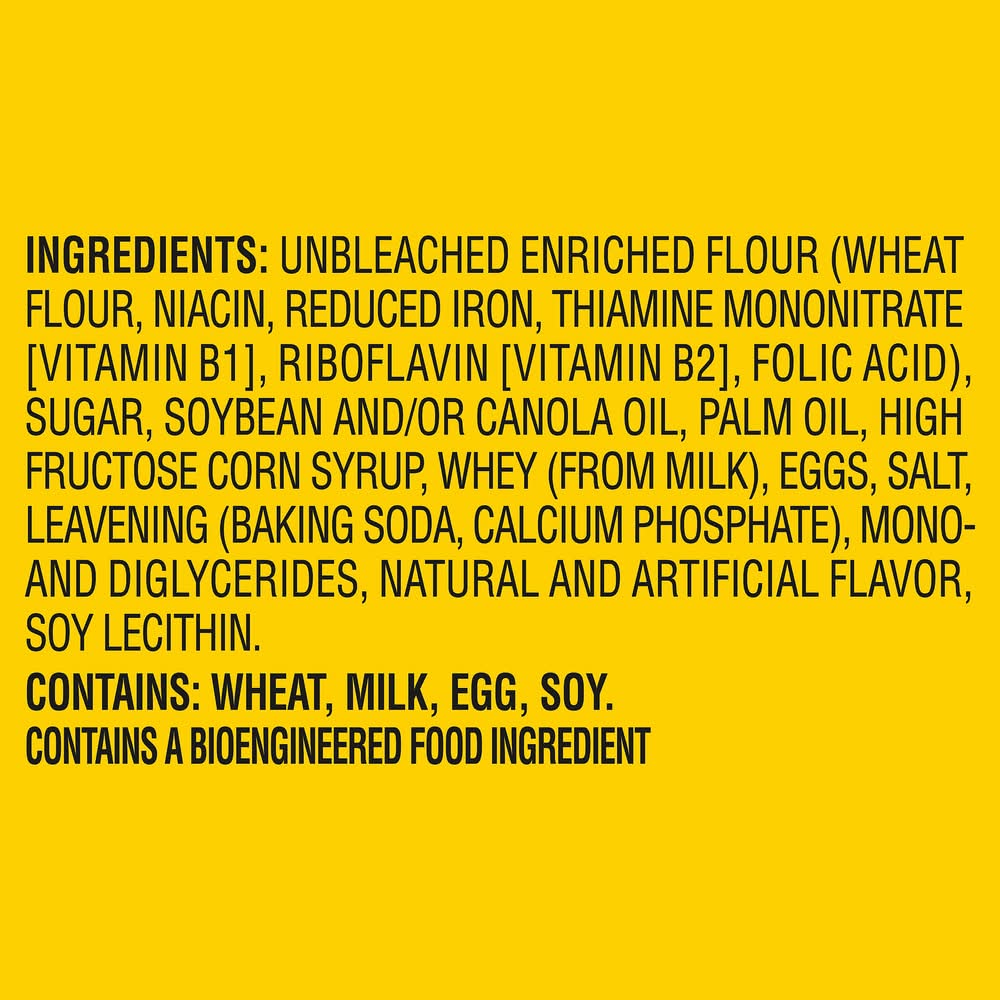 Ingredients: INGREDIENTS: UNBLEACHED ENRICHED FLOUR (WHEAT FLOUR, NIACIN, REDUCED IRON, THIAMINE MONONITRATE [VITAMIN B1], RIBOFLAVIN [VITAMIN B2], FOLIC ACID), SUGAR, SOYBEAN AND, OR CANOLA OIL, PALM OIL, HIGH FRUCTOSE CORN SYRUP, WHEY (FROM MILK), EGGS, SALT, LEAVENING (BAKING SODA, CALCIUM PHOSPHATE), MONO- AND DIGLYCERIDES, NATURAL AND ARTIFICIAL FLAVOR, SOY LECITHIN. CONTAINS: WHEAT, MILK, EGG, SOY. Contains: CONTAINS: WHEAT, MILK, EGG, SOY.