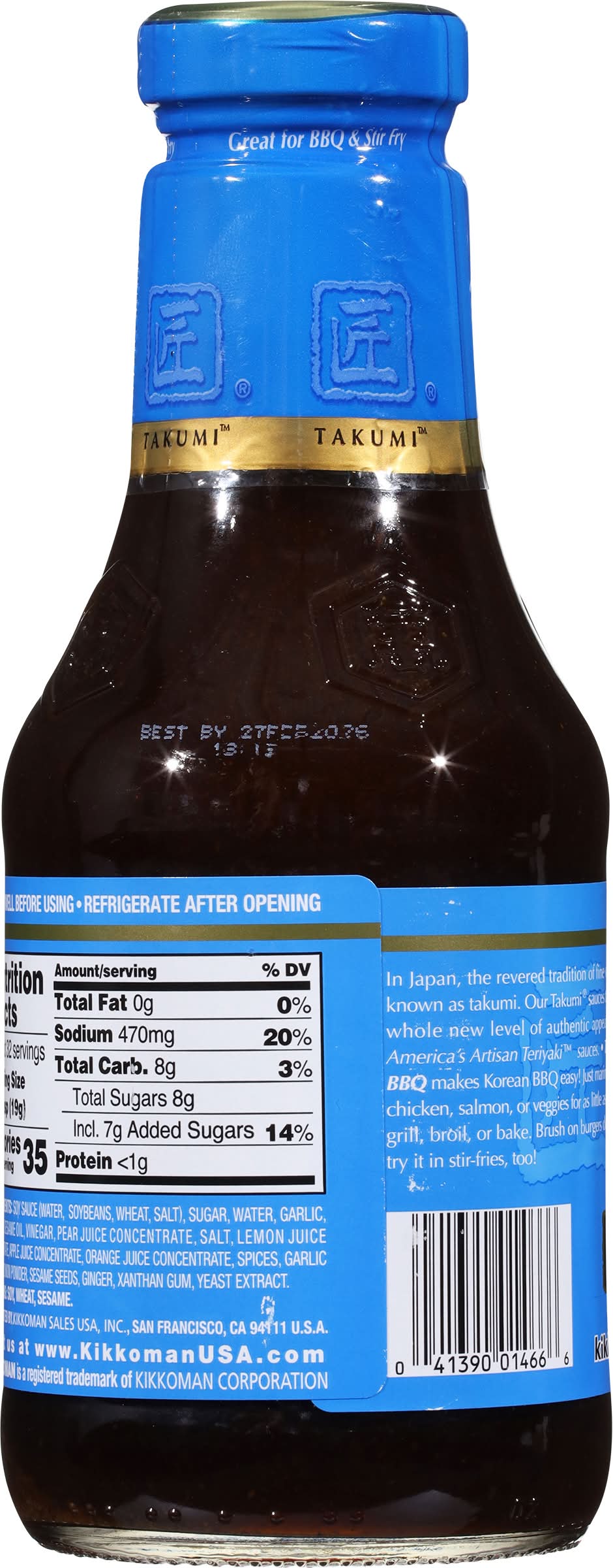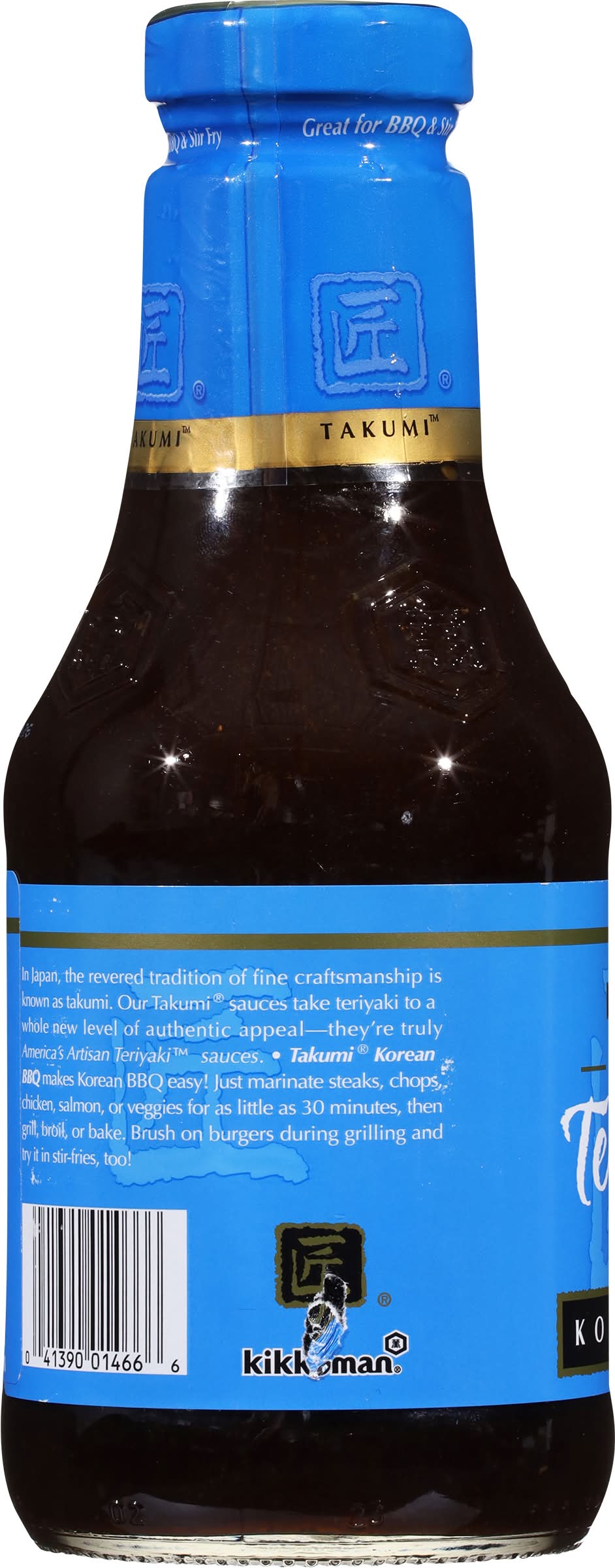 In Japan, the revered tradition of fine craftsmanship is known as Takumi. Our Takumi sauces take teriyaki to a whole new level of authentic appeal - they're truly America's Artisan Teriyaki sauces. Takumi Korean BBQ makes Korean BBQ easy! Just marinate steaks, chops, chicken, salmon, or veggies for as little as 30 minutes, then grill, broil, or bake. Brush on burgers during grilling and try it in stir-fries, too!