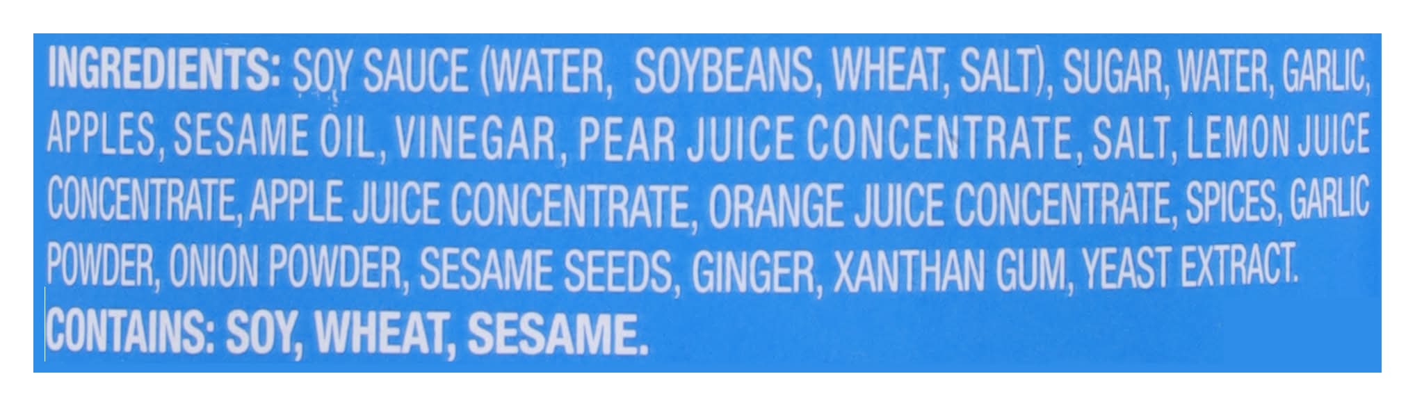 Ingredients: Soy Sauce (Water, Soybeans, Wheat, Salt), Sugar, Water, Garlic, Apples, Sesame Oil, Vinegar, Pear Juice Concentrate, Salt, Lemon Juice Concentrate, Apple Juice Concentrate, Orange Juice Concentrate, Spices, Garlic Powder, Onion Powder, Sesame Seeds, Ginger, Xanthan Gum, Yeast Extract Contains: Soybeans, Wheat, Sesame