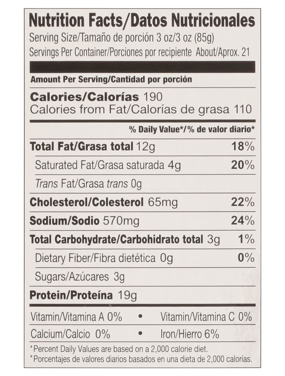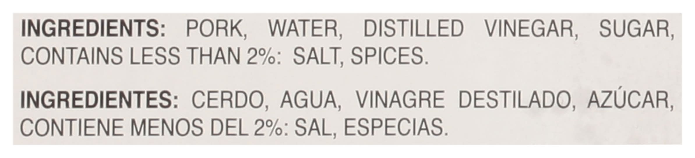 Ingredients: Pork, Water, Distilled Vinegar, Sugar, Contains Less than 2%: Salt, Spices