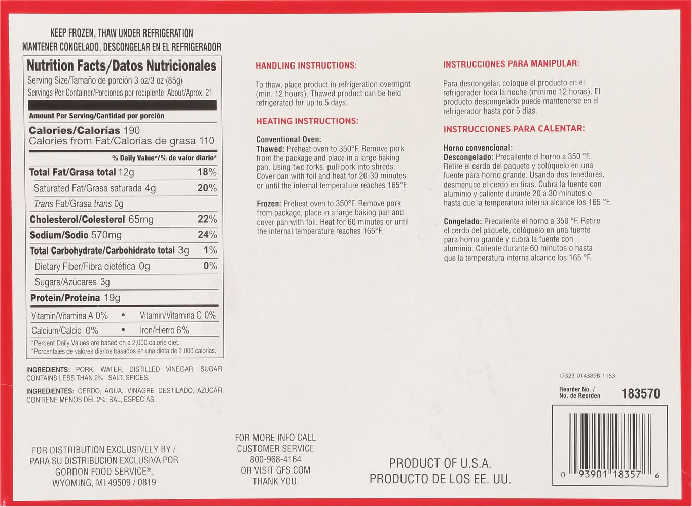 Directions for use: Heat Time: Conventional Oven: 20-30 min. from thawed. 60 min. from frozen. Cook thoroughly. Heating Instructions: Conventional Oven: Thawed: Preheat oven to 350 degrees F. Remove pork from the package and place in a large baking pan. Using two forks, pull pork into shreds. Cover pan with foil and heat for 20-30 minutes or until the internal temperature reaches 165 degrees F. Frozen: Preheat oven to 350 degrees F Remove pork from package, place in a large baking pan and cover pan with foil. Heat for 60 minutes or until the internal temperature reaches 165 degrees F. Keep frozen. Keep frozen, thaw under refrigeration. Handling Instructions: To thaw, place product in refrigeration overnight (min. 12 hours). Thawed product can be held refrigerated for up to 5 days. Storage recommendation: Keep frozen. Keep frozen, thaw under refrigeration. Handling Instructions: To thaw, place product in refrigeration overnight (min. 12 hours). Thawed product can be held refrigerated for up to 5 days.