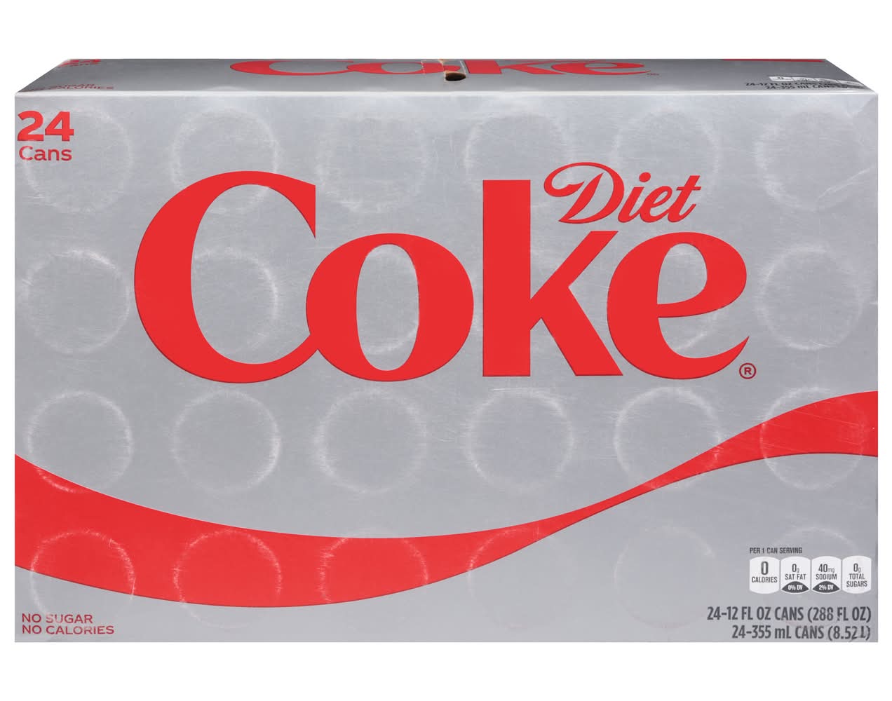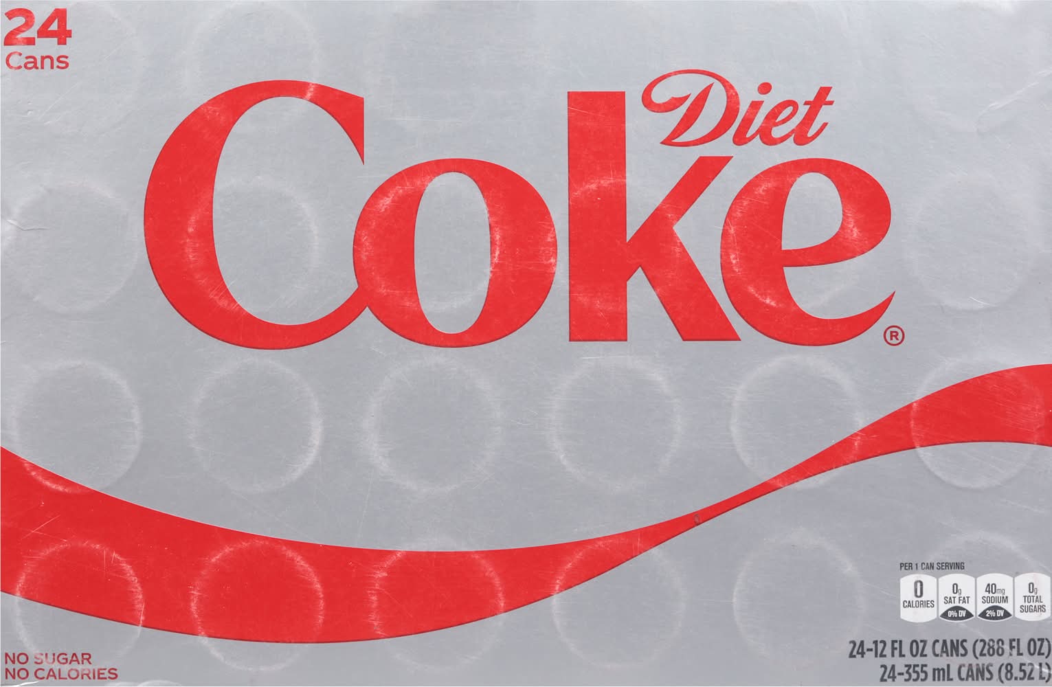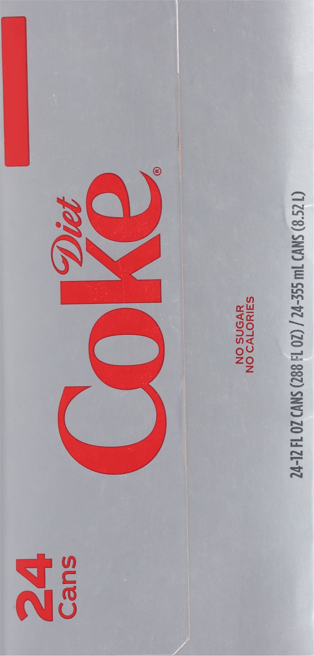 Soft Drink, Cola, Diet, Single-Serve, Can, 12 Fluid Ounce, 6 Ct Tray, 4 Per Case • Pack size: 24 • The Coca-Cola Company, Atlanta, GA, 30313 • Packaging: Reusable