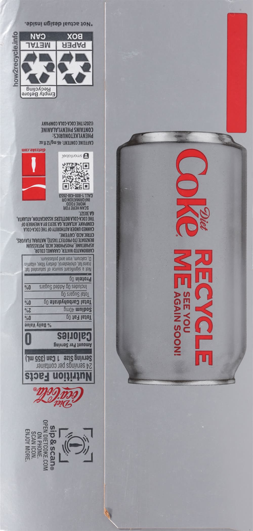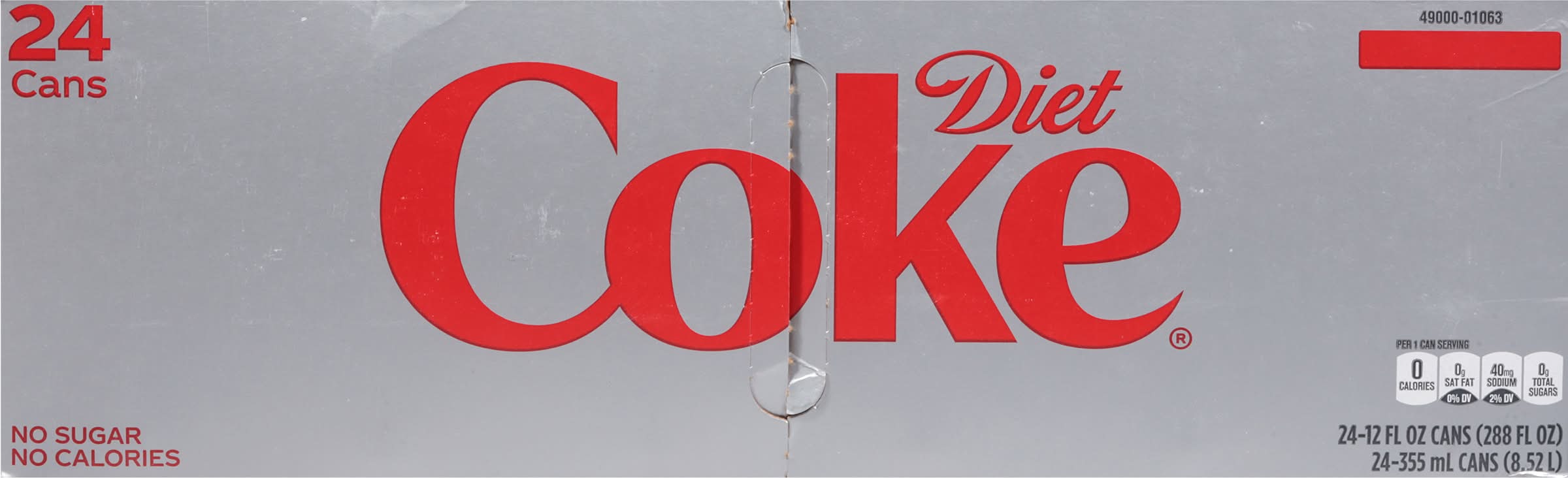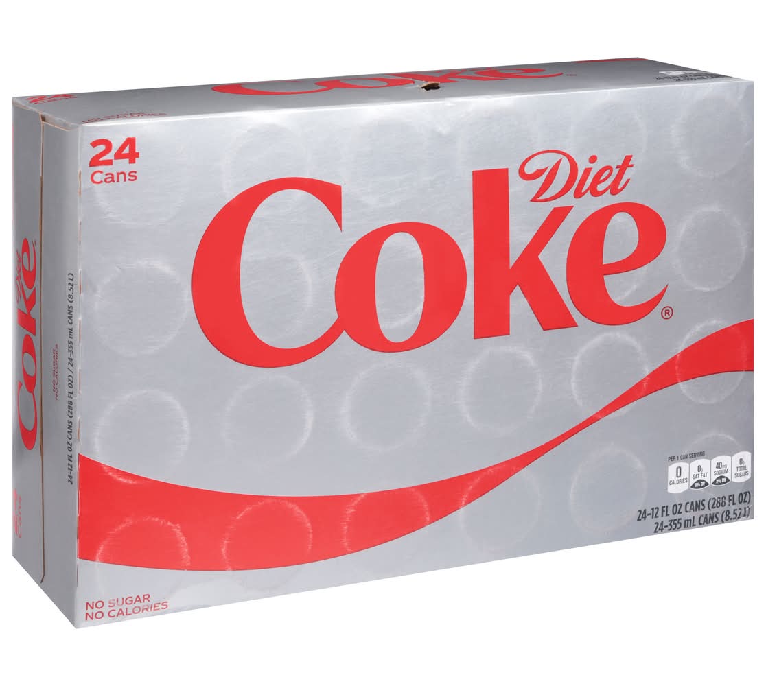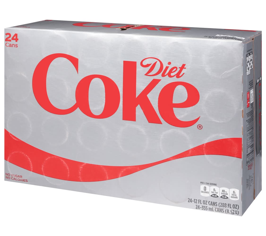 Soft Drink, Cola, Diet, Single-Serve, Can, 12 Fluid Ounce, 6 Ct Tray, 4 Per Case • Pack size: 24 • The Coca-Cola Company, Atlanta, GA, 30313 • Packaging: Reusable