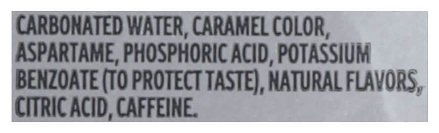 Ingredients: Carbonated Water, Caramel Color, Aspartame, Phosphoric Acid, Potassium Benzoate to Protect Taste, Natural Flavors, Citric Acid, Caffeine. Contains 46mg of caffeine