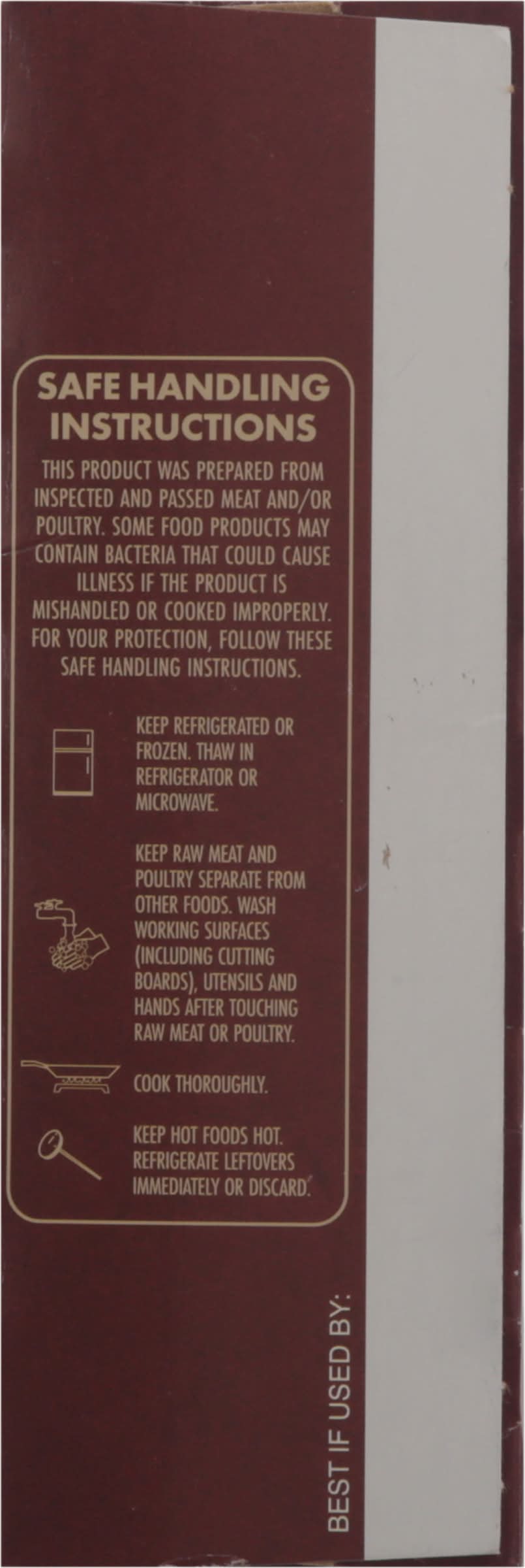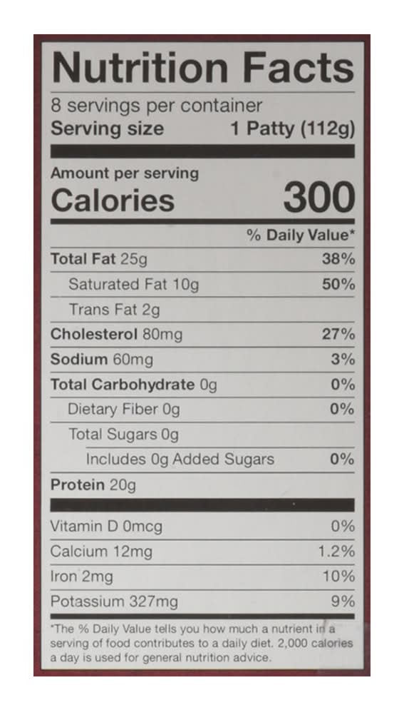 Directions for use: Directions: Frying Pan or Flat Top Grill: For medium well: Place frozen patty in the pre-heated fry pan or flat top grill over medium-high heat. Cook for 4 minutes on one side. Turn and cook for 2 minutes or until 160 degrees F internal temperature. Outdoor Grill: For medium well: Preheat gas grill at 350 degrees F or when charcoal turns white. Cook frozen patty 2 to 4 minutes on one side or until the juices come to the surface. Turn and cook 2 to 4 minutes or until 160 degrees F internal temperature. Under the Broiler: For medium-well: Place frozen patty in pre-heated broiler for 6 minutes or until 160 degrees F internal temperature. Cooking Instructions: Keep frozen until ready to cook. Thawing is not recommended; cook them frozen. Uncooked keep frozen. Storage recommendation: Uncooked keep frozen.