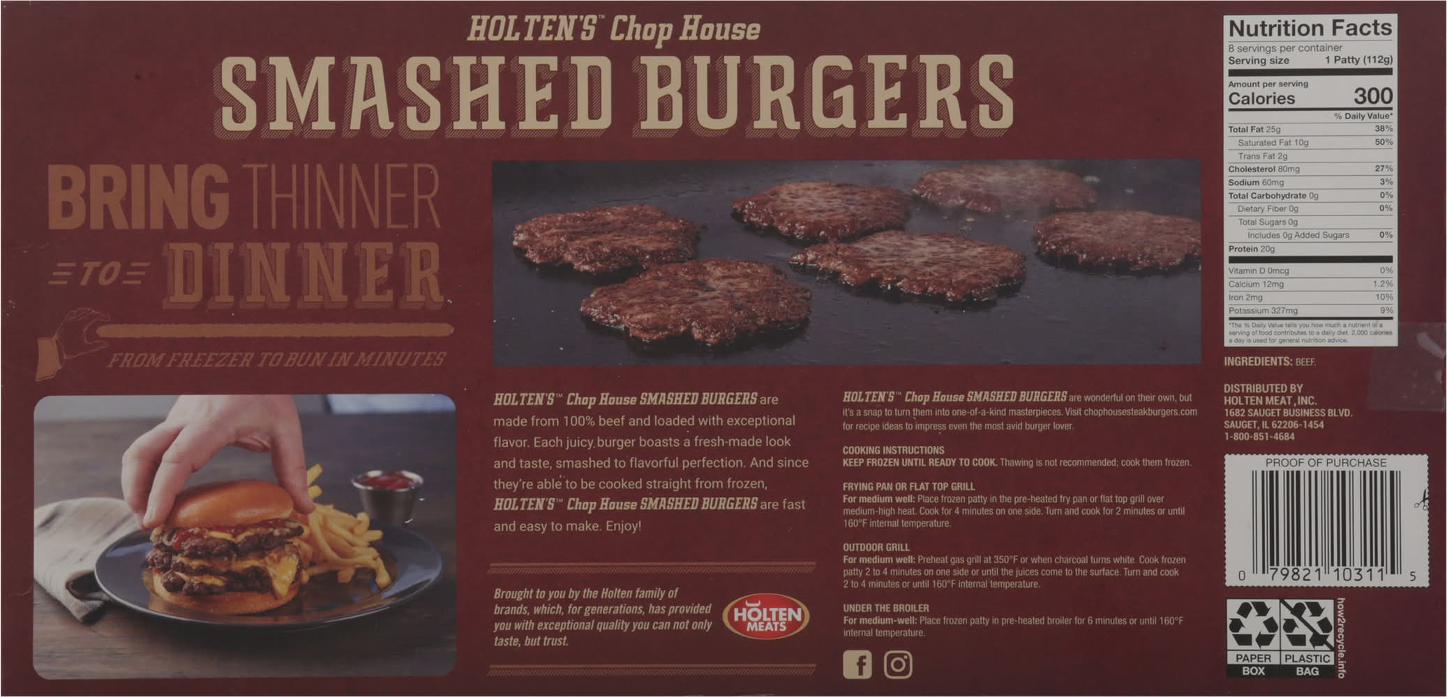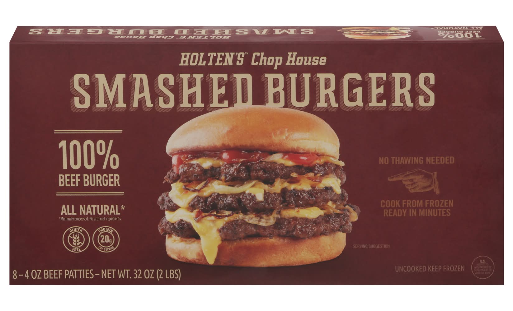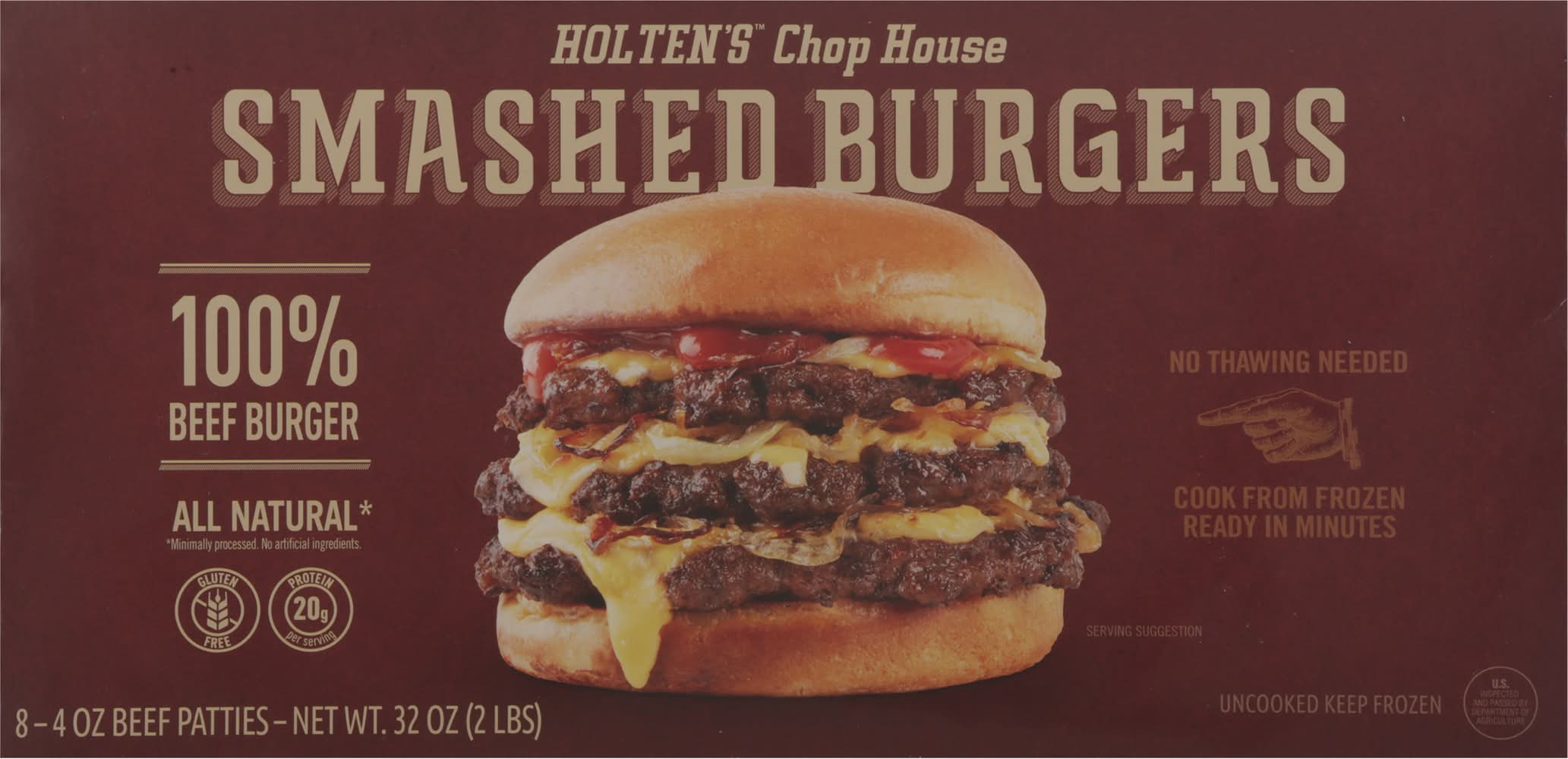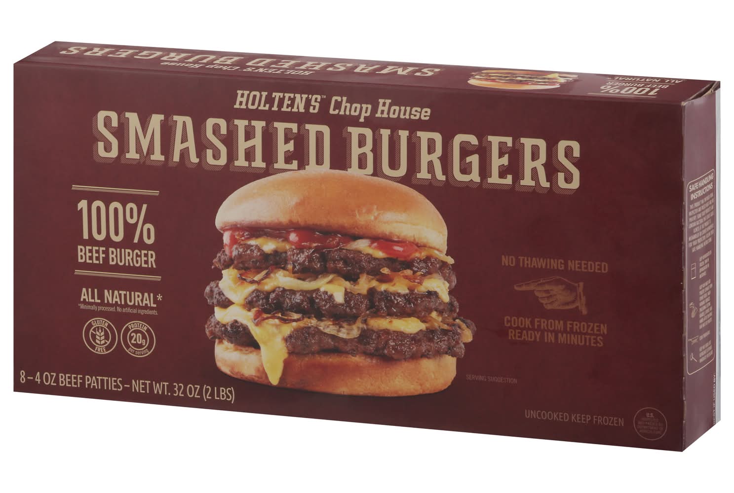 All natural (Minimally processed. No artificial ingredients). No thawing needed. Cook from frozen. Ready in minutes. Bring thinner to dinner. From freezer to bun in minutes. Chop House Smashed Burgers are made from 100% beef and loaded with exceptional flavor. Each juicy burger boasts a fresh-made look and taste, smashed to flavorful perfection. And since they're able to be cooked straight from frozen, Chop House Smashed Burgers are fast and easy to make. Pack size: 8