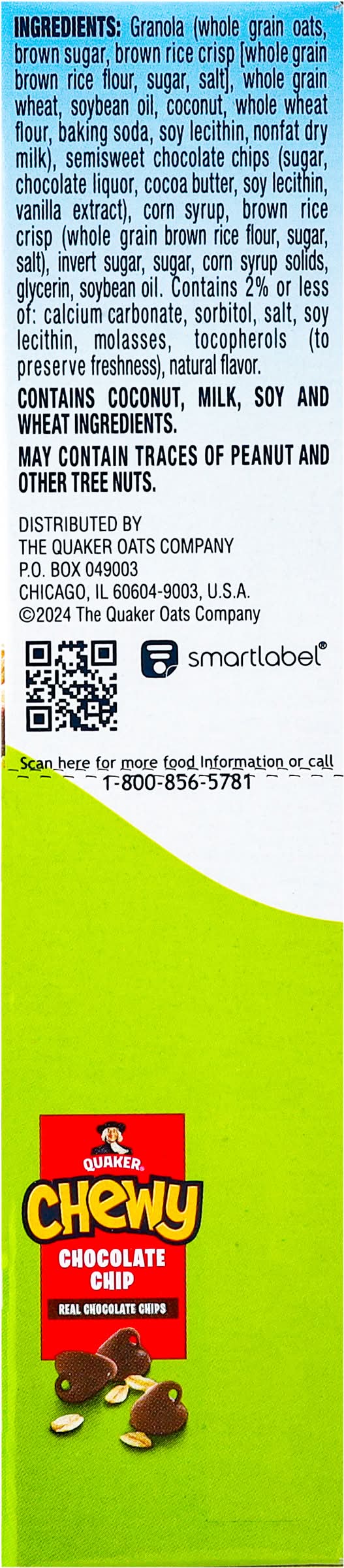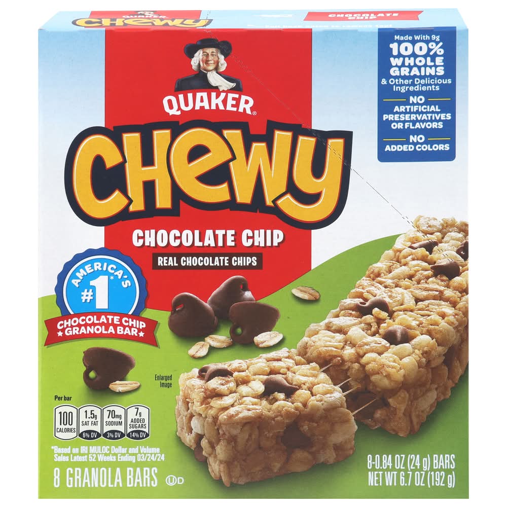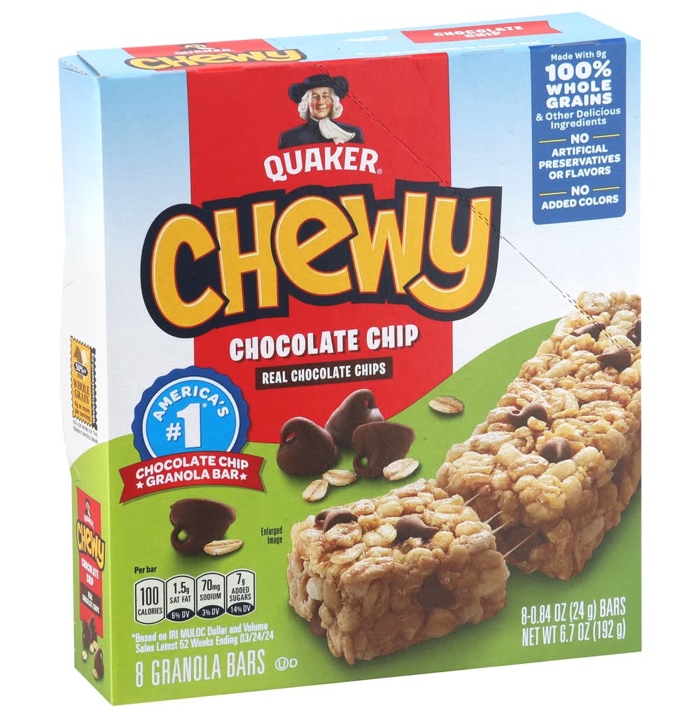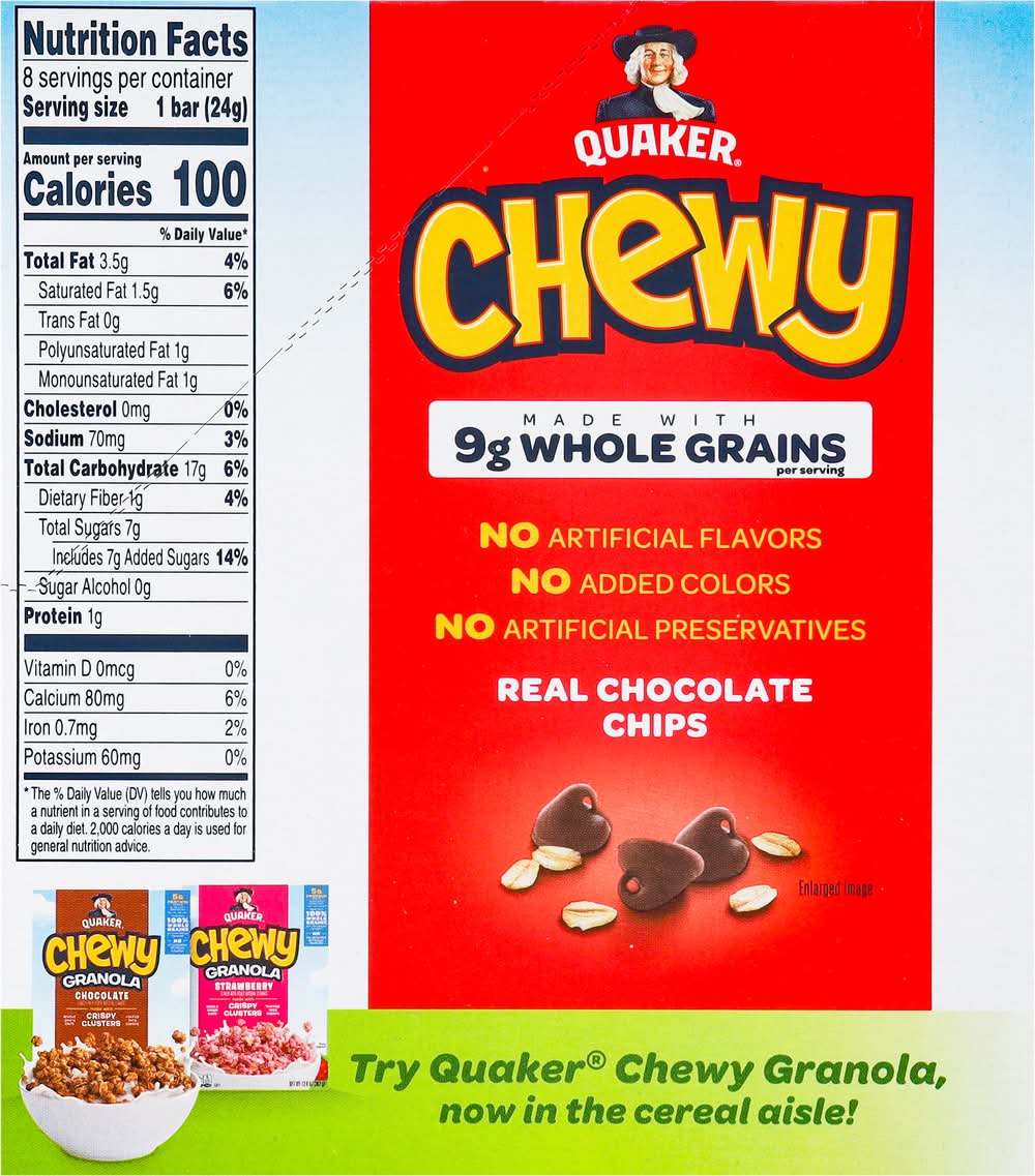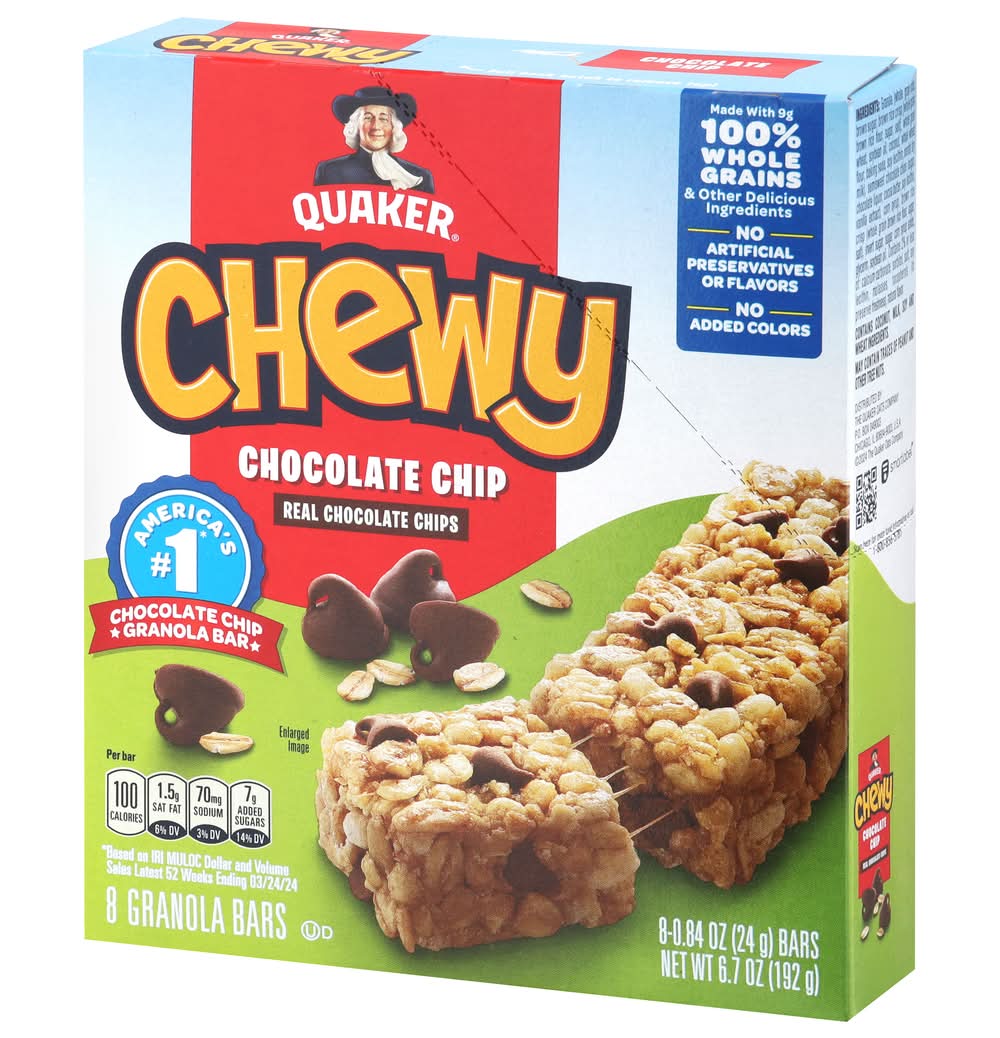 Bars, Granola, Chocolate Chip, Whole Grain, 8 Ct Box • Flavor: Chocolate chip • Pack size: 8 • The Quaker Oats Company, PO Box 049003,Chicago,IL,60604-9003