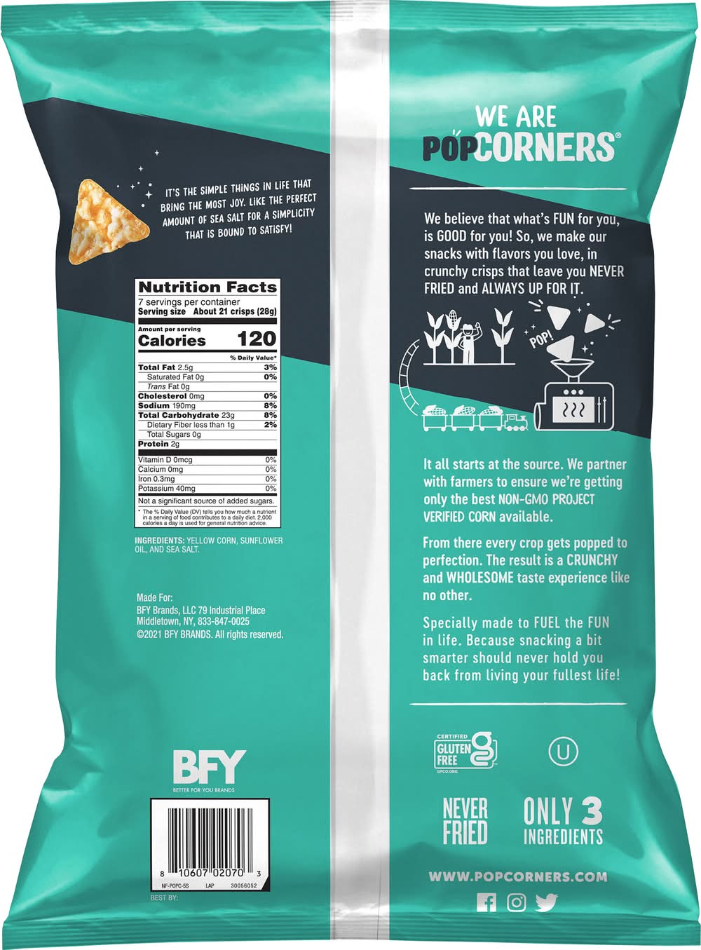 The crunchy and wholesome popped-corn snack. No artificial flavors. No artificial colors or preservatives. Never fried. It’s the simple things in life that bring the most joy. Like the perfect amount of sea salt for a simplicity that is bound to satisfy. We are popcorners: we believe that what's fun for you, is good for you. So we make our snacks with flavors you love, in crunchy crisps that leave you never fried and always up for it. It all starts at the source. Specially made to fuel the fun in life. Because snacking a bit smarter should never hold you back from living your fullest life. • Flavor: Sea salt • Quaker Food and Beverage, Middletown,NY