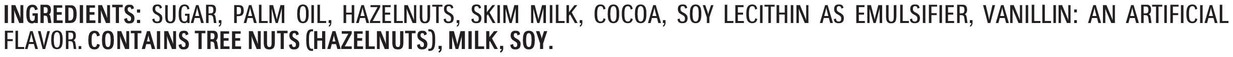 Ingredients: SUGAR, PALM OIL, HAZELNUTS, SKIM MILK, COCOA, LECITHIN AS EMULSIFIER Contains: Milk and its derivates, Tree nuts and their derivatives, Soybean and its Derivatives