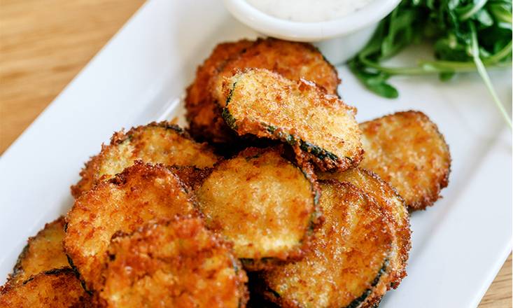 Crips-fried parmesan & panko- encrusted fresh zucchini slices. Serve with pickled red onions & scratch-made ranch-style herbed dressing.