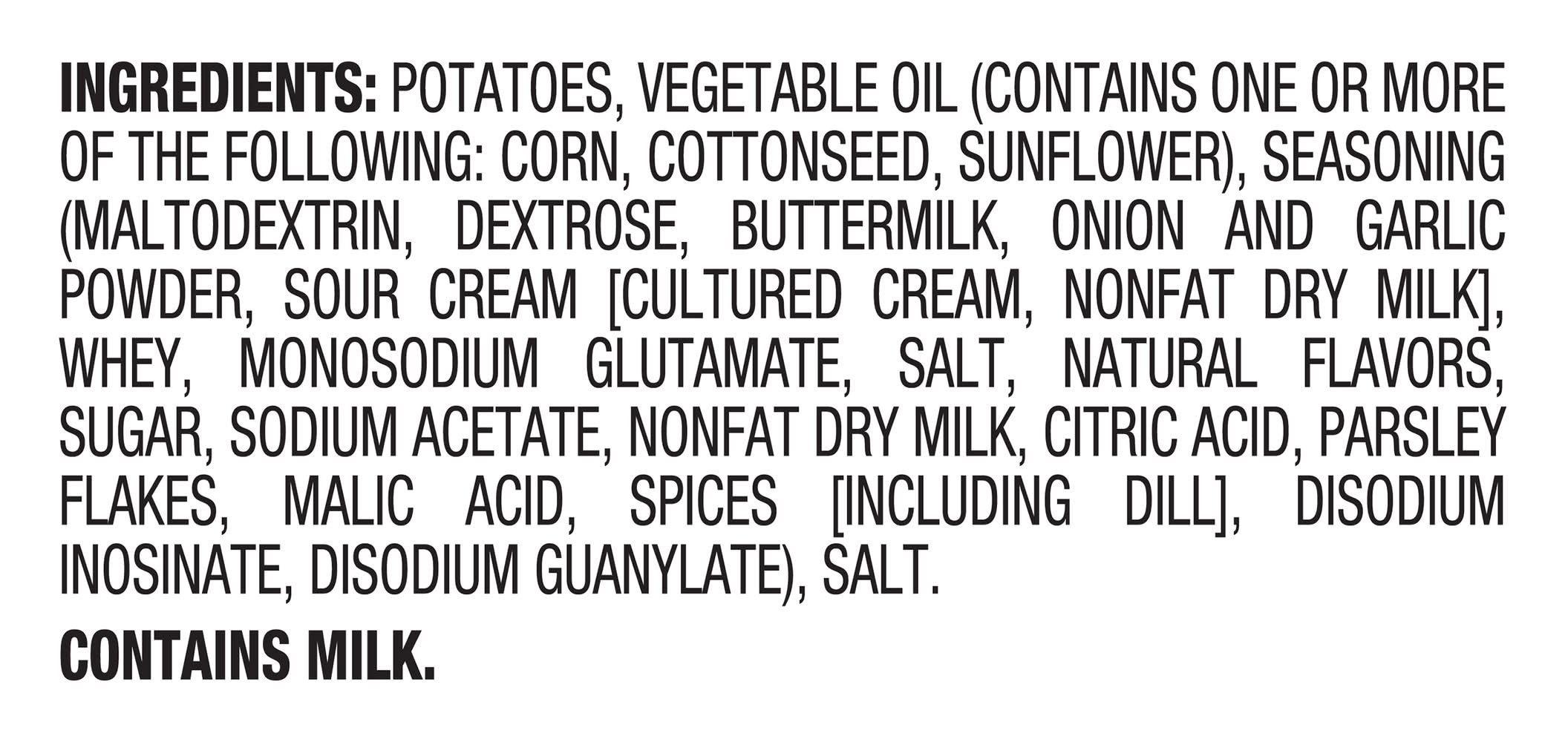Ingredients: Potatoes, Vegetable Oil (Contains One or More of the Following: Corn, Cottonseed, Sunflower), Seasoning (Maltodextrin, Dextrose, Buttermilk, Onion and Garlic Powder, Sour Cream [Cultured Cream, Nonfat Dry Milk], Whey, Monosodium Glutamate, Salt, Natural Flavors, Sugar, Sodium Acetate, Nonfat Dry Milk, Citric Acid, Parsley Flakes, Malic Acid, Spices [Including Dill], Disodium Inosinate, Disodium Guanylate), Salt Contains: Milk, Corn