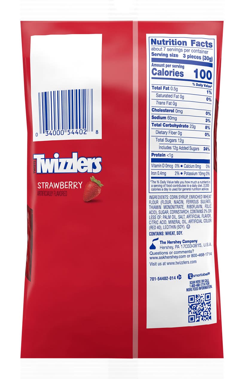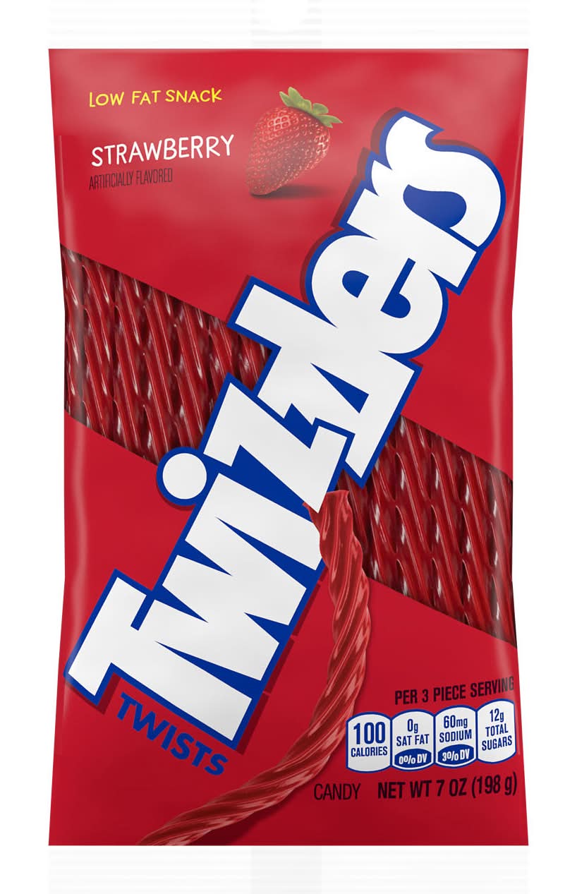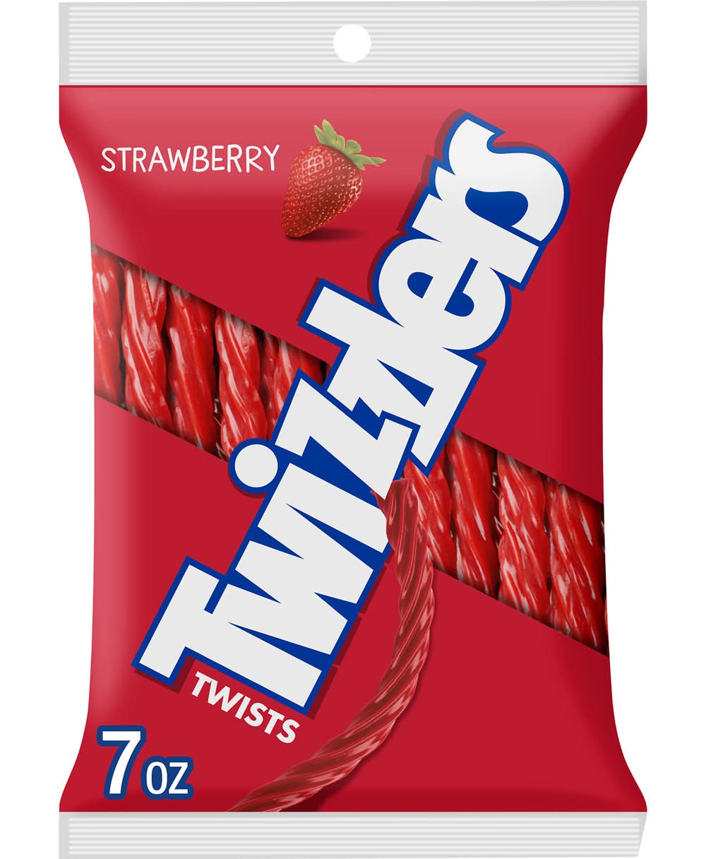 There's no party like a TWIZZLERS candy party! Seriously though, TWIZZLERS Twists strawberry flavored chewy candies are too fun not to enjoy with family and friends at every movie marathon, birthday party and tailgate. With a bag of strawberry flavored chewy candies ready for action, you'll never find yourself without a delicious shareable snack. Bite both ends of a TWIZZLERS Twists candy off to create a straw, then dip your straw into a cold glass of milk, a steaming hot chocolate or a frothy milkshake. If you're more into eating a couple of these chewy treats on their own, you'll be ready to go the second you open the bag. Keep your pantry stocked with kosher certified, low fat TWIZZLERS Twists candies, store some in your work desk, take a bag on a road trip or bring a pack to your next party gathering. Looking for an even greater adventure? For a unique twist, melt several white creme or milk chocolate bars, dip your TWIZZLERS candies in the melted gooiness, then cover each piece in sprinkles and let the new treats cool! They even make scrumptious holiday treats as Christmas stocking stuffers, Halloween trick-or-treat candy, Easter basket fillers and Valentine's Day presents. • Brand: Twizzler's • Flavor: Strawberry • kosher, low fat • Number of servings: 7