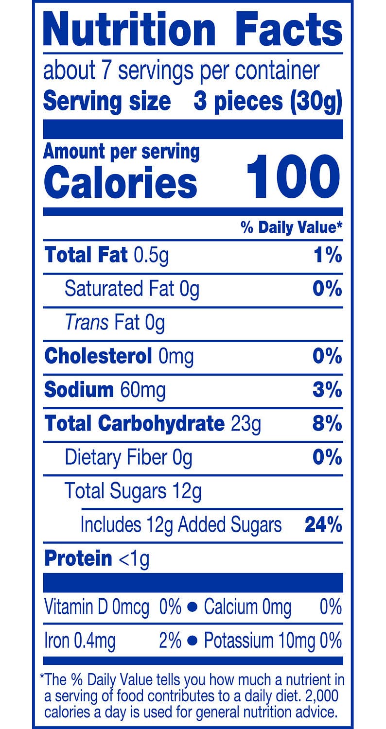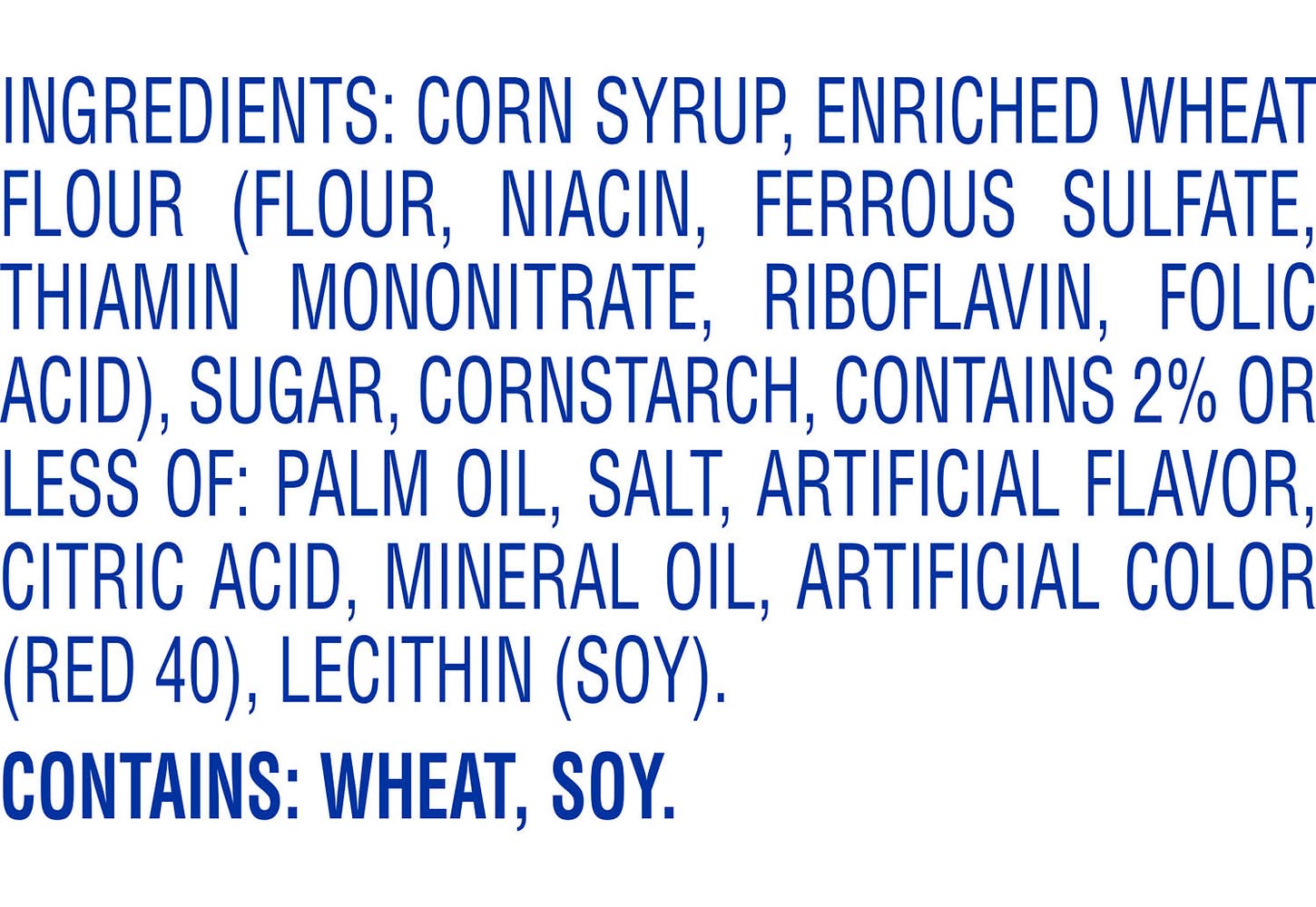 Ingredients: CORN SYRUP, ENRICHED WHEAT FLOUR (FLOUR, NIACIN, FERROUS SULFATE, THIAMIN MONONITRATE, RIBOFLAVIN, FOLIC ACID), SUGAR, CORNSTARCH, CONTAINS 2% OR LESS OF: PALM OIL, SALT, ARTIFICIAL FLAVOR, CITRIC ACID, MINERAL OIL, ARTIFICIAL COLOR (RED 40), LECITHIN (SOY), . Contains: Contains: Wheat|Soy