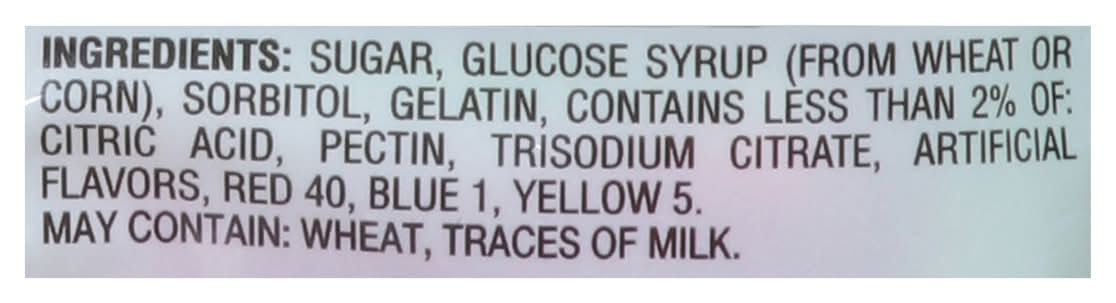 Ingredients: Sugar, Glucose Syrup (from Wheat or Corn), Sorbitol, Gelatin, Contains Less than 2% of: Citric Acid, Pectin, Trisodium Citrate, Artificial Flavors, Red 40, Blue 1, Yellow 5 Contains: Wheat, Corn, Wheat, Milk