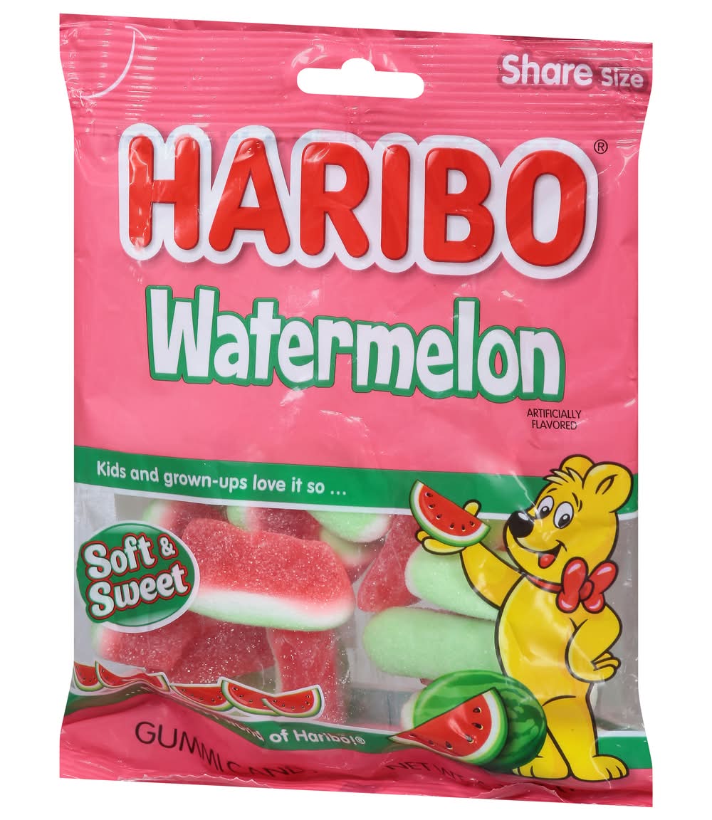 Artificially flavored. Kids and grown-ups love it so - the happy world of Haribo. Soft & sweet. • Brand: Haribo • Flavor: Watermelon