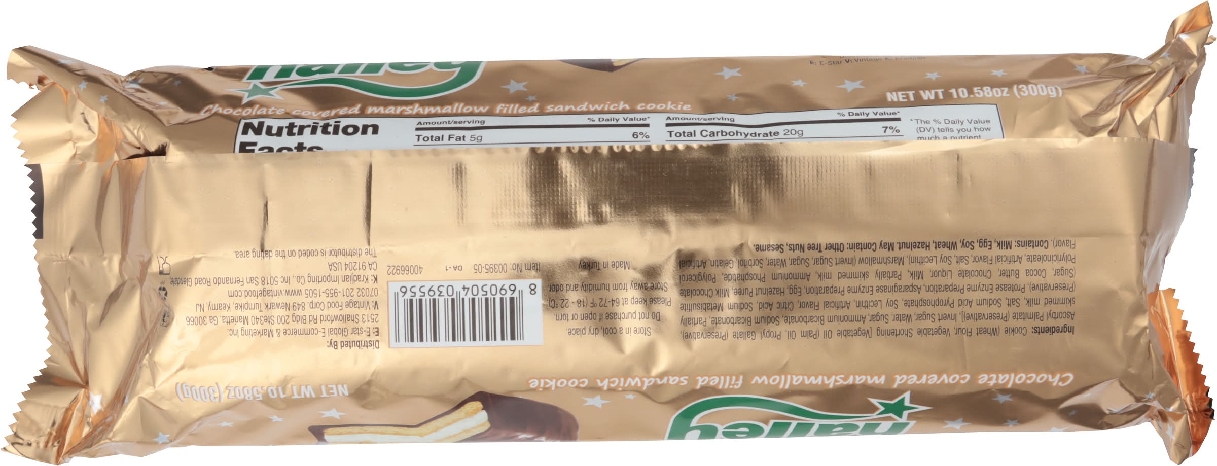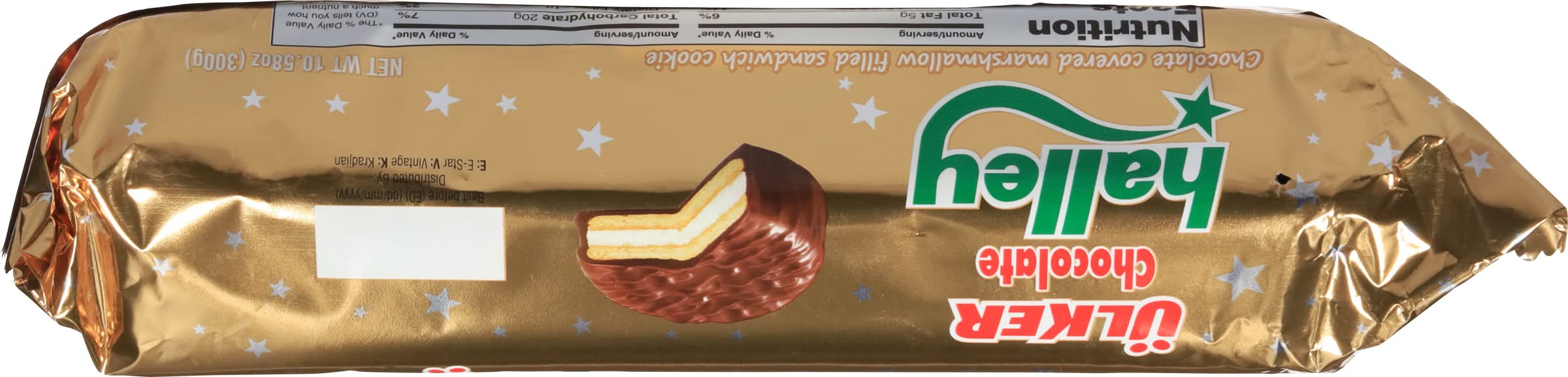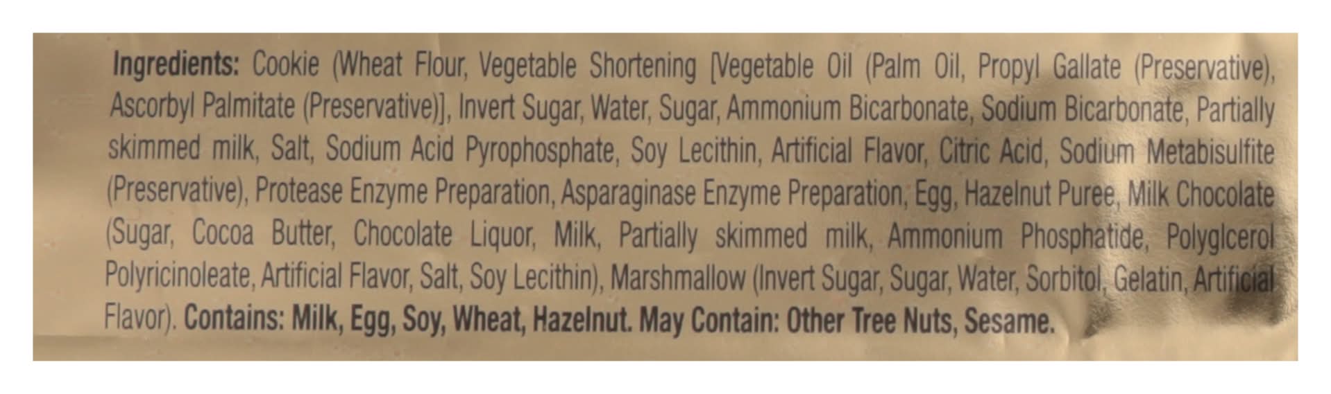 Ingredients: Cookie (Wheat Flour, Vegetable Shortening [Vegetable Oil (Palm Oil, Propyl Gallate (Preservative), Ascorbyl Palmitate (Preservative)], Invert Sugar, Water, Sugar, Ammonium Bicarbonate, Sodium Bicarbonate, Partially Skimmed Milk, Salt, Sodium Acid Pyrophosphate, Soy Lecithin, Artificial Flavor, Citric Acid, Sodium Metabisulfite (Preservative), Protease Enzyme Preparation, Asparaginase Enzyme Preparation, Egg, Hazelnut Puree, Milk Chocolate (Sugar, Cocoa Butter, Chocolate Liquor, Milk, Partially Skimmed Milk, Ammonium Phosphatide, Polyglcerol Polyricinoleate, Artificial Flavor, Salt, Soy Lecithin), Marshmallow (Invert Sugar, Sugar, Water, Sorbitol, Gelatin, Artificial Flavor) Contains: Milk, Eggs, Soybeans, Wheat, Tree Nuts, Hazelnuts/Filberts, Sulfites, Tree Nuts, Sesame