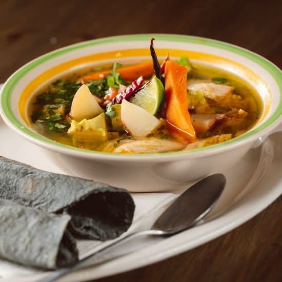 GLUTEN FREE Homemade chicken broth, chicken, rice, pico de gallo, sliced avocado and tortilla strips. Served with warm tortillas