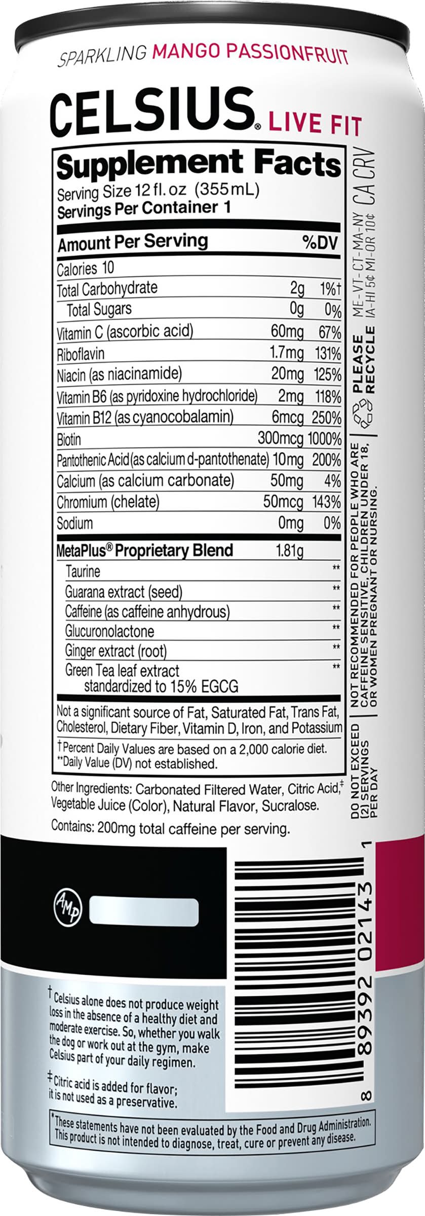 It contains no artificial colors or flavors and is free from sugar, gluten, high fructose corn syrup, and aspartame. It includes a proprietary Meta Plus formula with ingredients such as green tea with EGCG, ginger, and guarana seed, which are known to support thermogenesis, a process that can boost the body's metabolic rate. Drink is formulated to energize and support metabolism when paired with a healthy diet and moderate exercise as part of a daily regimen. It is backed by six published university studies and encourages recycling of its packaging. • Brand: Celsius • Flavor: Mango passionfruit • gluten-free, kosher, vegan, GMO-free, • Packaging: Reusable