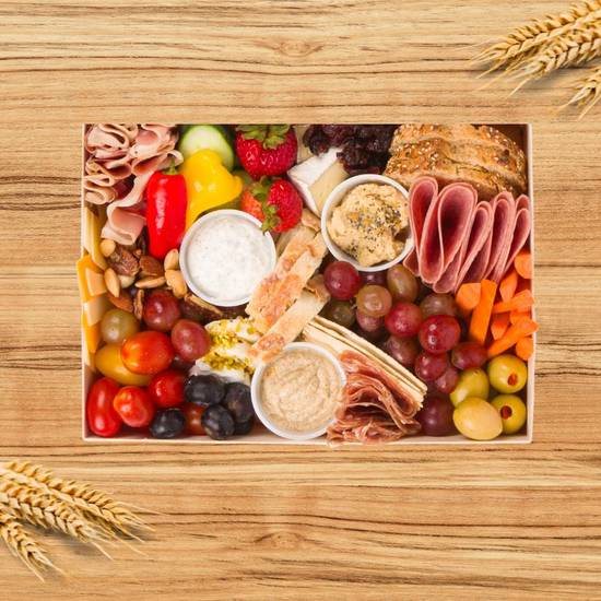 VEGEGRAZIAN - Spreads (Classic Hummus or Roasted Red Pepper Hummus, Cottage Cheese Dill Dip, Beet Hummus, Cranberry Orange Jam, Raspberry Jam, Lemon Dill Mayo, Spicy Mayo, Honey), Breads (Baguette Bread, Seed Bread), Crunchy (Raincoast Crackers, Wheat Crackers), Cheese (Assorted Sliced Cheeses, Brie Cheese), Fruit & Veg (Grapes, Tomatoes, Strawberries, Blackberries, Blueberries, Raspberries, Kiwi, Mini Sweet Peppers, Asparagus, Broccoli, Cauliflower), Sweets & Nuts (Dessert Bread, Craisins, Assorted Mixed Nuts, Chocolate Bark).