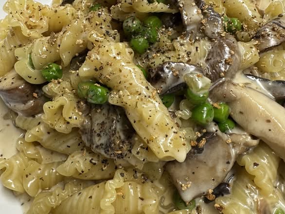 Black pepper infused Campanelle pasta (Bell Shaped) sauteed w/ Shiitake & Portobello in a creamy Brandy sauce finished w/ Porcini dust