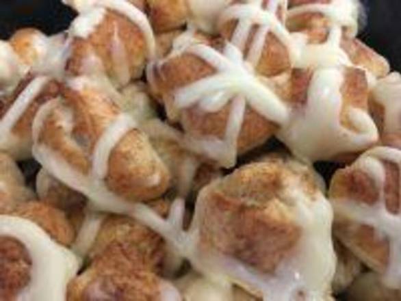 Bite size Breadsticks mixed with a Butter Cinnamon Surger Mix and topped with Cream Cheese Frosting