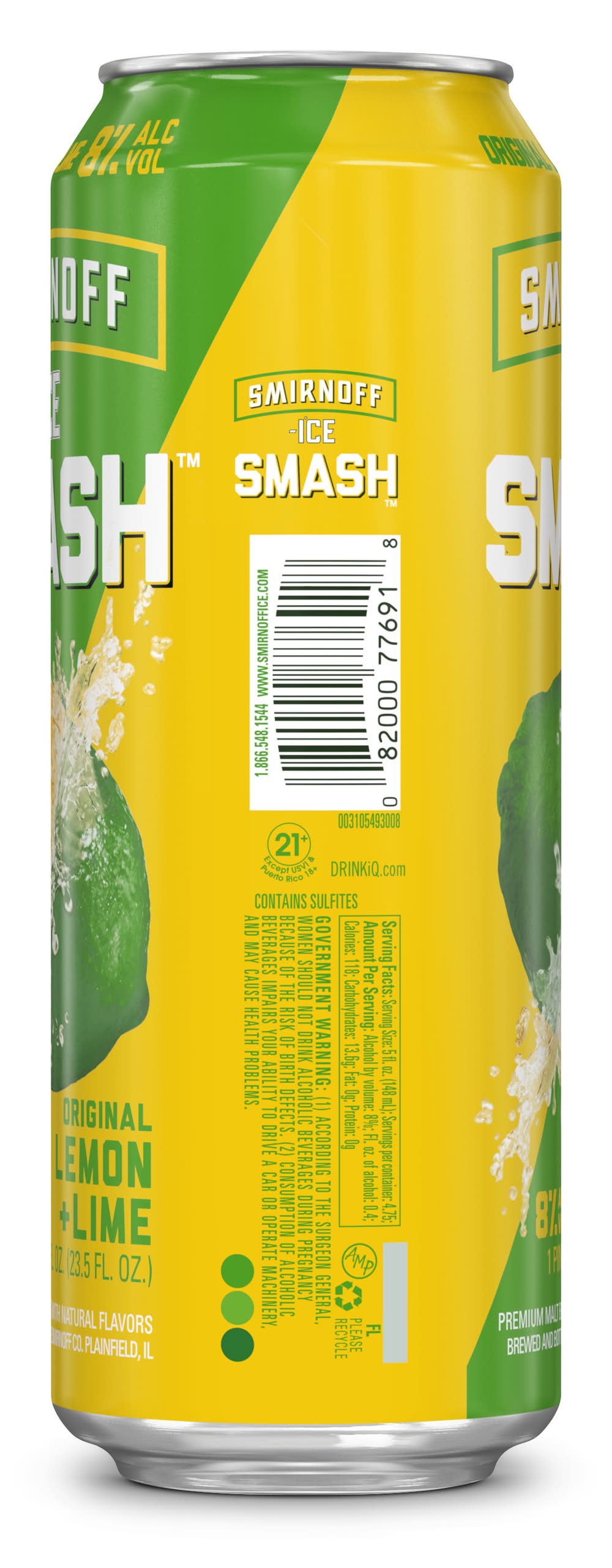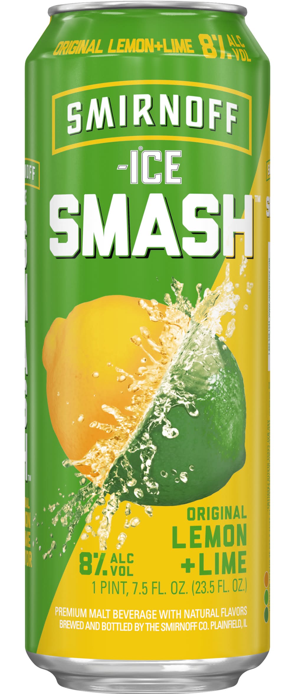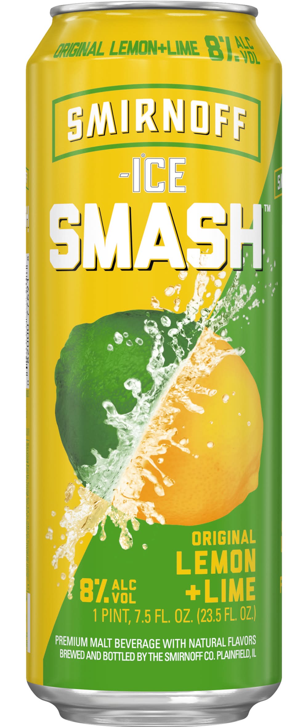 Ice Smash Original Malt Beer is a malt beverage that combines the mellow taste of lemon with the tangy kick of lime. Lightly carbonated, it offers a refreshing flavor suitable for enjoyment at the poolside or beach. Since its debut in 1999, Smirnoff Ice has become a widely enjoyed drink. Consumers are reminded to enjoy this product responsibly. • Brand: Smirnoff • Flavor: Lemon & lime • Alcohol by volume: 8% • Diageo North America, 300 Park Avenue, New York, NY 10022