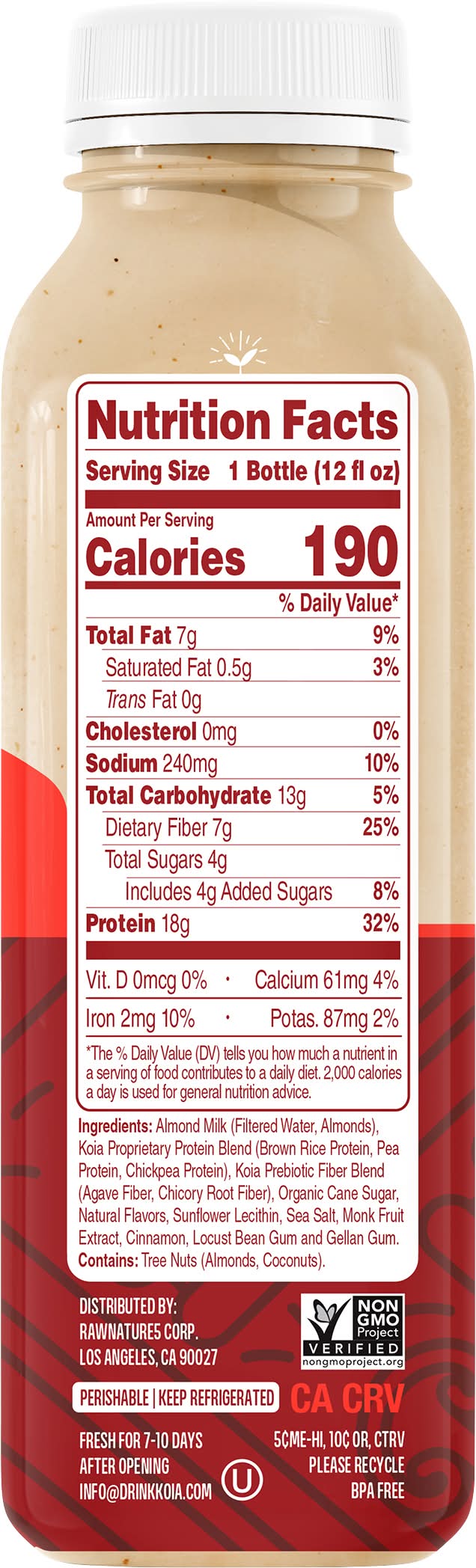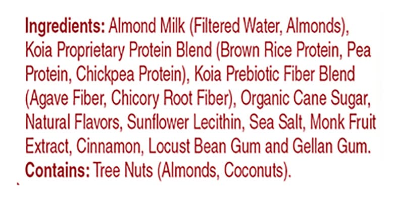 Ingredients: Almond Milk (Filtered Water, Almonds), Koia Proprietary Protein Blend (Brown Rice Protein, Pea Protein, Chickpea Protein), Koia Prebiotic Fiber Blend (Agave Fiber, Chicory Root Fiber), Organic Cane Sugar, Natural Flavors, Sunflower Lecithin, Sea Salt, Monk Fruit Extract, Cinnamon, Locust Bean Gum and Gellan Gum Contains: Tree Nuts, Almonds, Tree Nuts, Coconuts