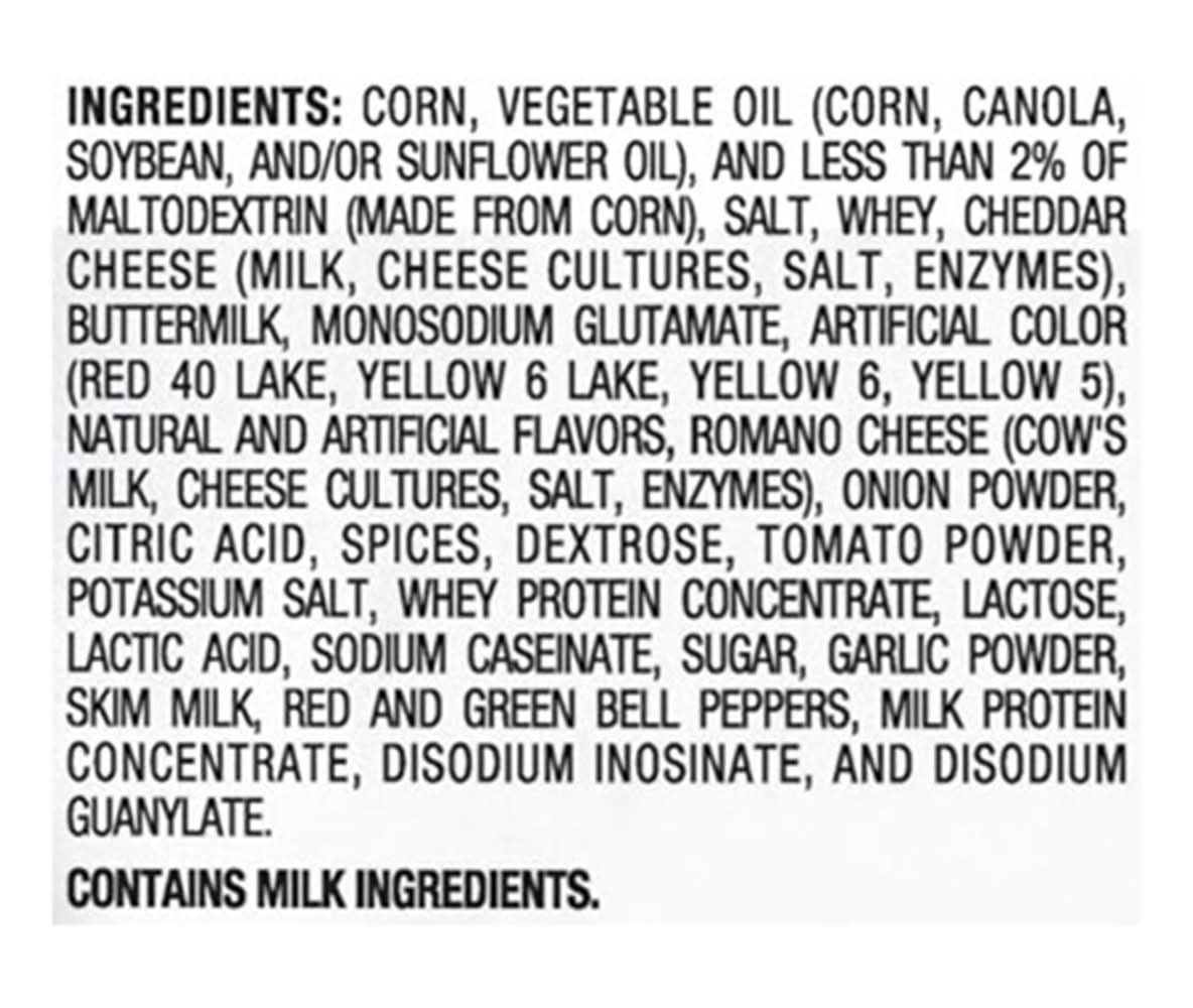 Ingredients: Corn, Vegetable Oil (Corn, Canola, Soybean, and/or Sunflower Oil), and Less than 2% of Maltodextrin (Made from Corn), Salt, Whey, Cheddar Cheese (Milk, Cheese Cultures, Salt, Enzymes), Buttermilk, Monosodium Glutamate, Artificial Color (Red 40 Lake, Yellow 6 Lake, Yellow 6, Yellow 5), Natural and Artificial Flavors, Romano Cheese (Cow's Milk, Cheese Cultures, Salt, Enzymes), Onion Powder, Citric Acid, Spices, Dextrose, Tomato Powder, Potassium Salt, Whey Protein Concentrate, Lactose, Lactic Acid, Sodium Caseinate, Sugar, Garlic Powder, Skim Milk, Red and Green Bell Peppers, Milk Protein Concentrate, Disodium Inosinate, and Disodium Guanylate Contains: Milk, Corn, Lactose, Soybeans