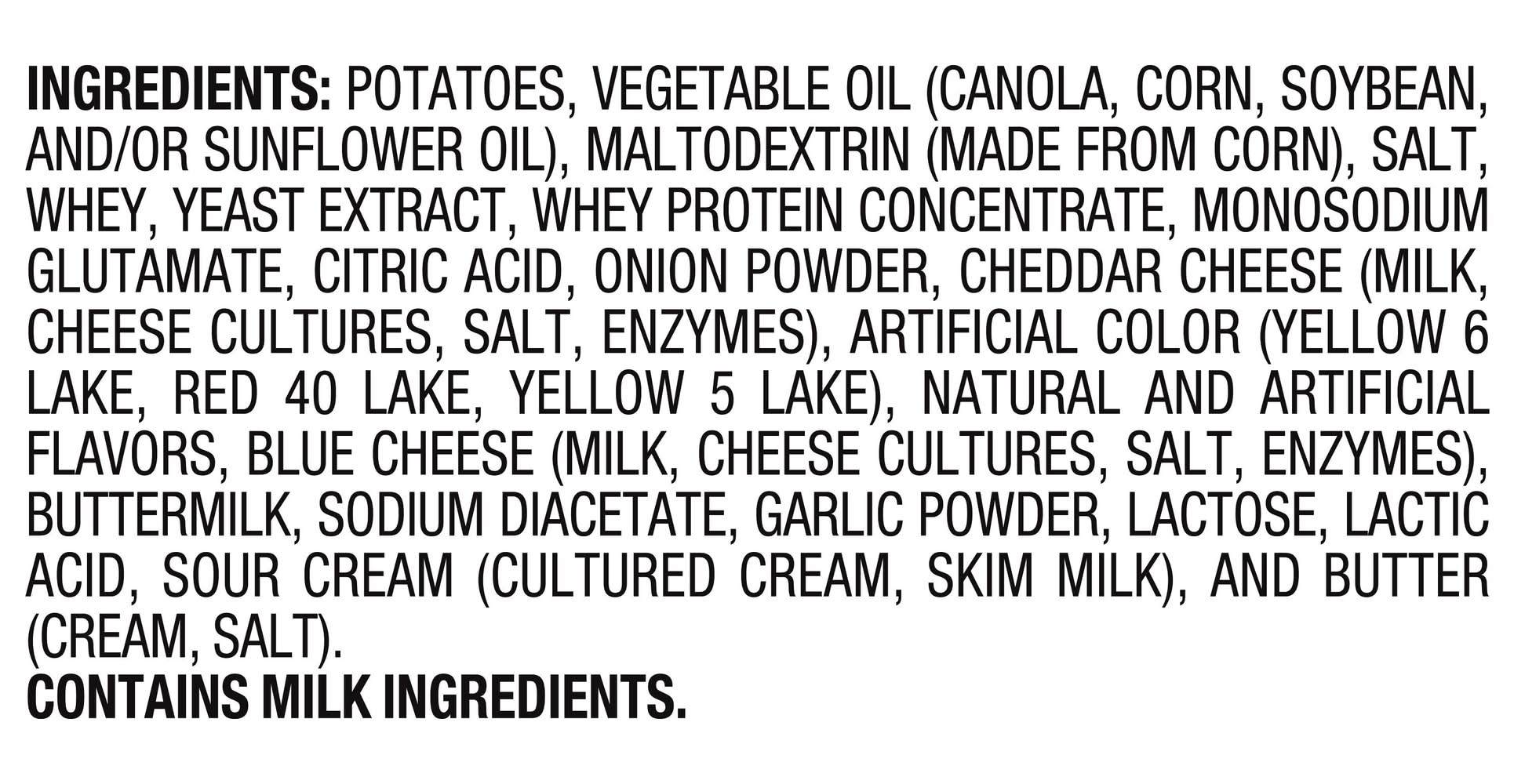 Ingredients: Potatoes, Vegetable Oil (Canola, Corn, Soybean, And/Or Sunflower Oil), Maltodextrin (Made From Corn), Salt, Whey, Yeast Extract, Whey Protein Concentrate, Monosodium Glutamate, Citric Acid, Onion Powder, Cheddar Cheese (Milk, Cheese Cultures, Salt, Enzymes), Artificial Color (Yellow 6 Lake, Red 40 Lake, Yellow 5 Lake), Natural And Artificial Flavors, Blue Cheese (Milk, Cheese Cultures, Salt, Enzymes), Buttermilk, Sodium Diacetate, Garlic Powder, Lactose, Lactic Acid, Sour Cream (Cultured Cream, Skim Milk), And Butter (Cream, Salt), . CONTAINS MILK INGREDIENTS. Contains: Milk, Soybeans, Lactose