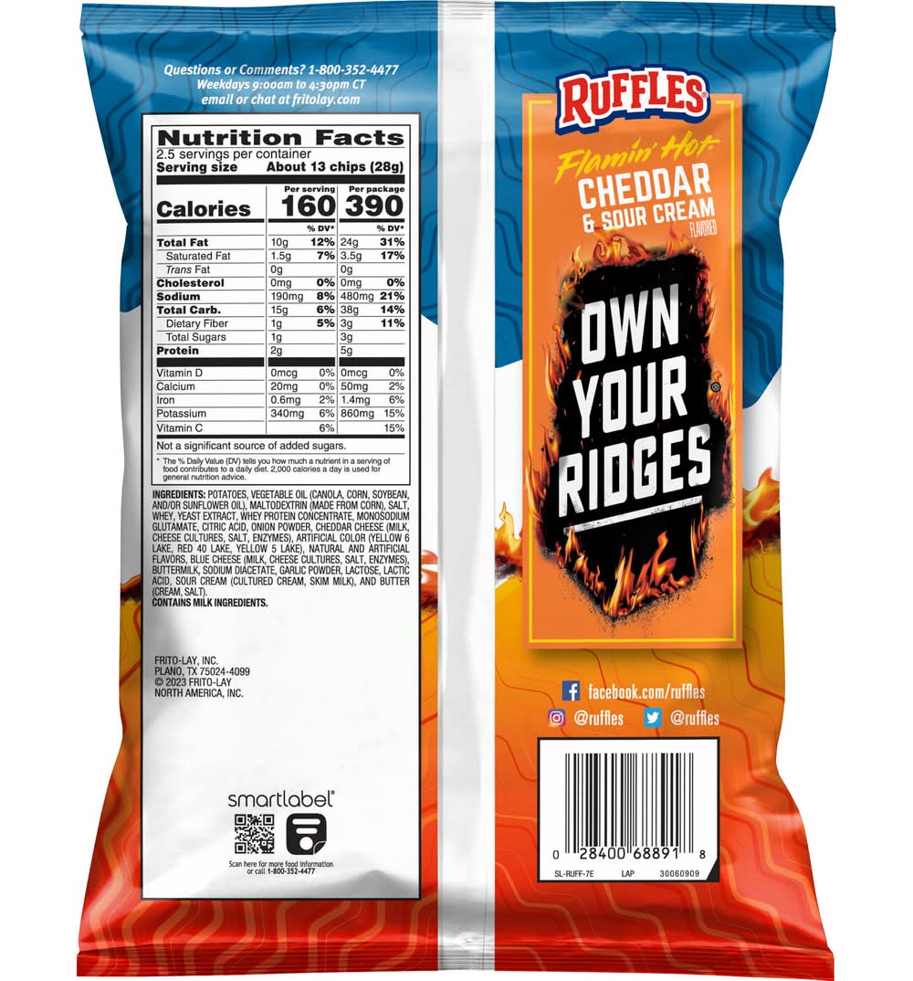 With crunchy ridges made to stand up to even the thickest dips, potato chips bring epic flavor and snack satisfaction to any get-together. • Flavor: Flamin' hot cheddar & sour cream • Frito-Lay, Inc., Plano, TX, 75024-4099, 800-352-4477