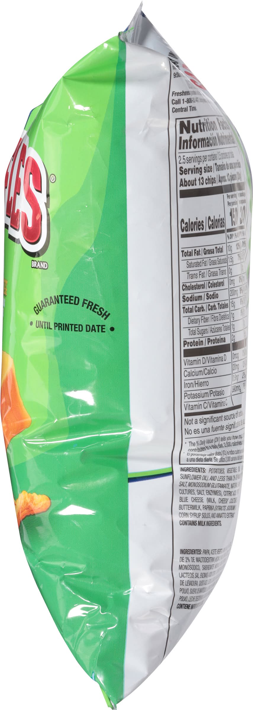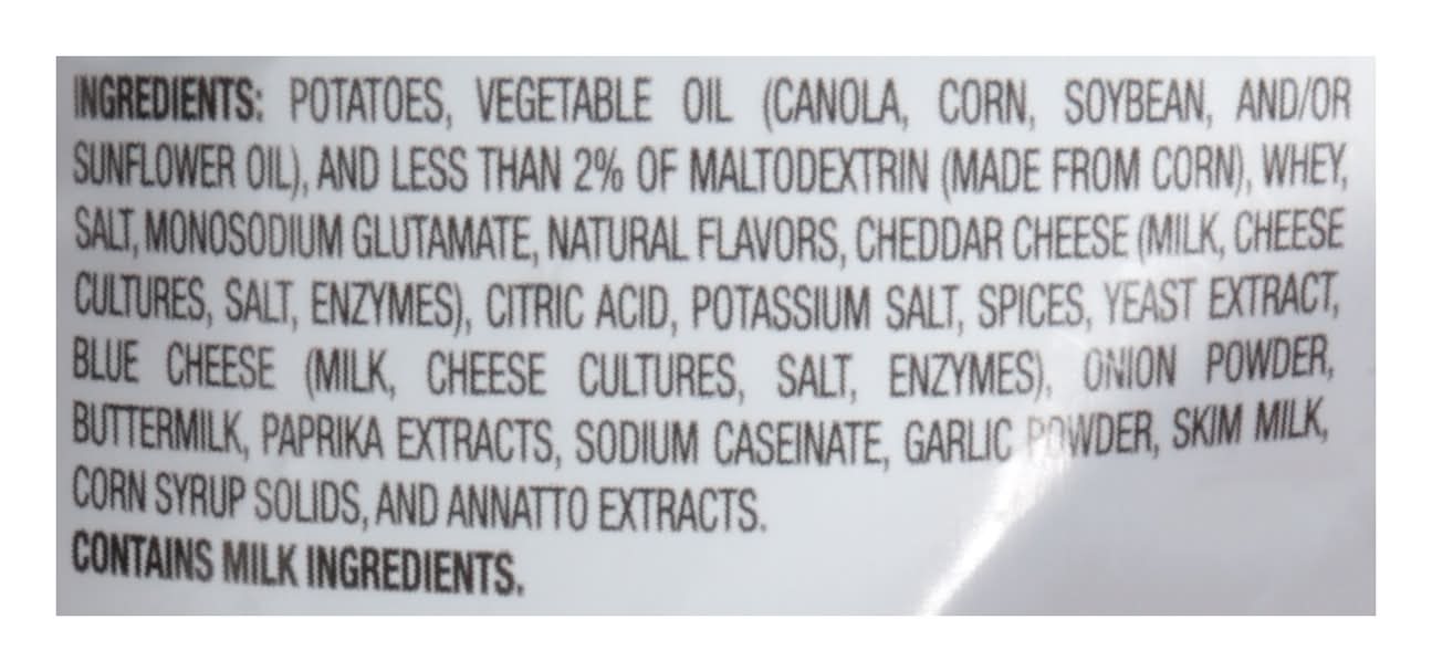 Ingredients: Potatoes, Vegetable Oil (Canola, Corn, Soybean, and/or Sunflower Oil), and Less than 2% of Maltodextrin (Made from Corn), Whey, Salt, Monosodium Glutamate, Natural Flavors, Cheddar Cheese (Milk, Cheese Cultures, Salt, Enzymes), Citric Acid, Potassium Salt, Spices, Yeast Extract, Blue Cheese (Milk, Cheese Cultures, Salt, Enzymes), Onion Powder, Buttermilk, Paprika Extracts, Sodium Caseinate, Garlic Powder, Skim Milk, Corn Syrup Solids, and Annatto Extracts