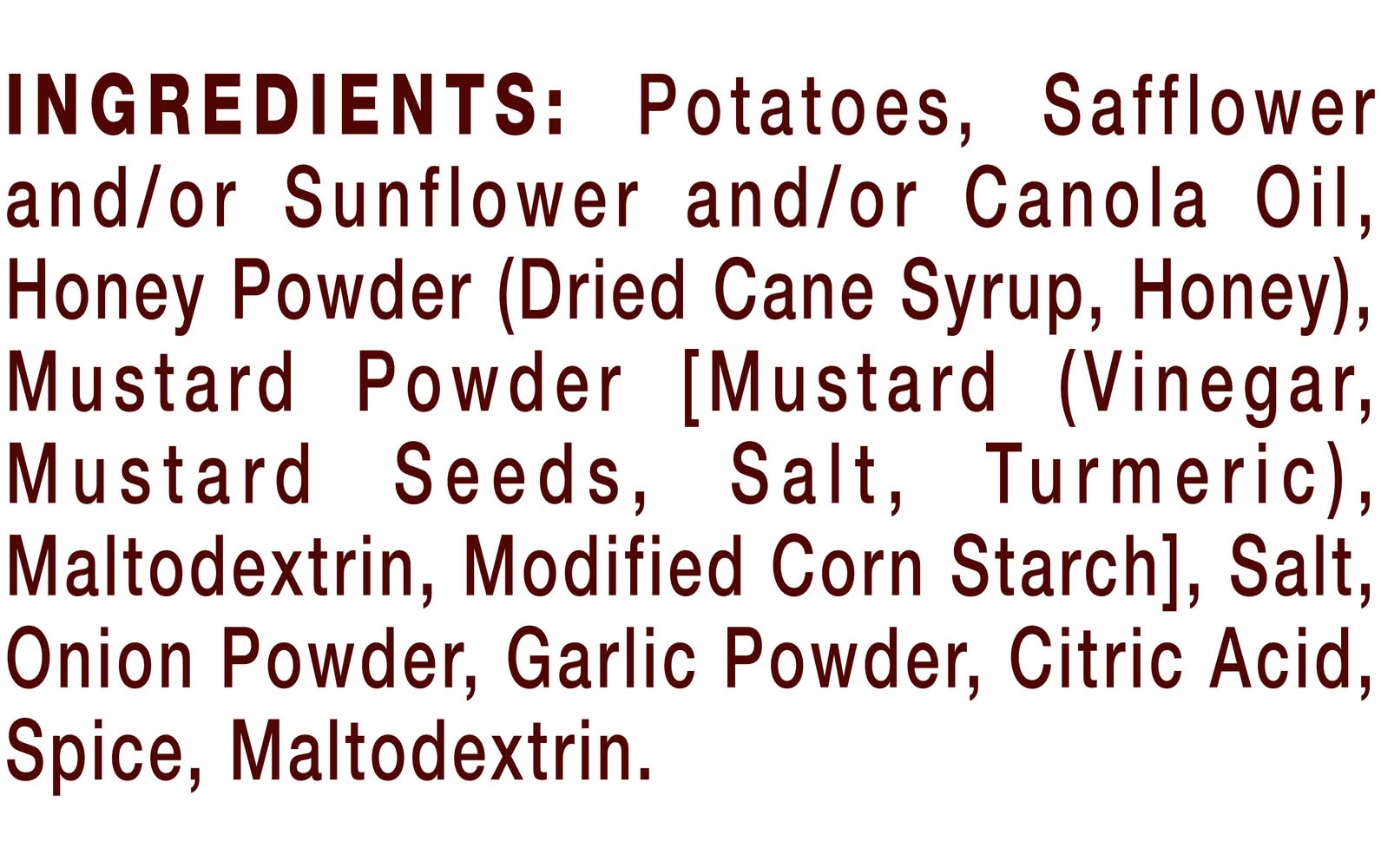 Ingredients: INGREDIENTS: Potatoes, Safflower and, or Sunflower and, or Canola Oil, Honey Powder (Dried Cane Syrup, Honey), Mustard Powder [Mustard (Vinegar, Mustard Seeds, Salt, Turmeric), Maltodextrin, Modified Corn Starch], Salt, Onion Powder, Garlic Powder, Citric Acid, Spice, Maltodextrin. Contains: 'Free From Gluten'