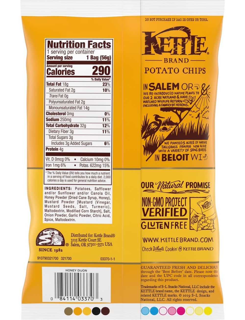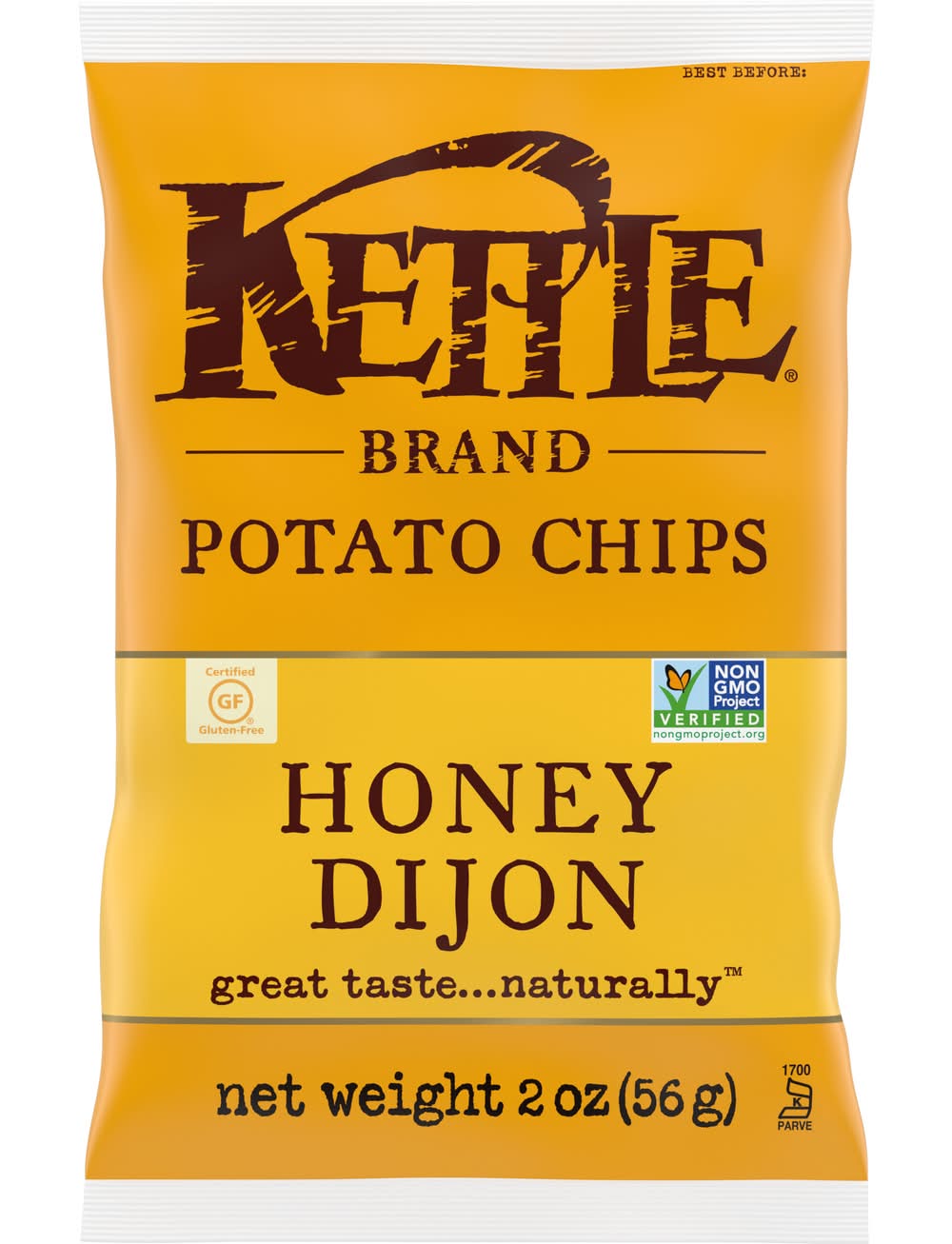Kettle Brand Honey Dijon kettle chips start with a search for undisputed potao excellence. Determined not to disrupt the flawless, spudsy goodness, these beauties are kettle cooked, skin on, one small batch at a time. Try the incredible sweet and savory flavor and you just might fall in love. Dijon mustard is tangy, sophisticated, and just a little bit snooty. Honey is smooth, sweet, and more than a little wild. Together, they’re a match made in heaven. When you open a bag of our Kettle Brand potato chips, you know you're getting incredible kettle chips made with authentic recipes by real people. From their farms to our kitchens and then to your home, the time and attention every Kettle Brand worker puts into their products is care you can trust. All that, plus Kettle Brand chips deliver a delicious snack that’s non-GMO Project Verified, and Certified Gluten-Free. These 2-ounce snack bags of kettle chips are great at home or on-the-go. Kettle Brand potato chips. Extra in a good way. • Brand: Kettle brand • Flavor: Honey dijon • gluten-free, GMO-free • Number of servings: 1