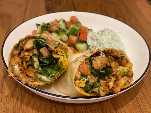 Shawarma spiced chicken, tzatziki, arugula, cucumber, tomatoes, flour tortilla wrap. Served with a side of chopped salad.