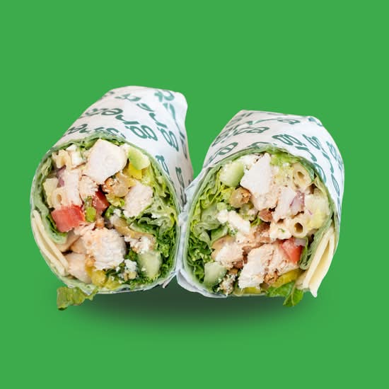 romaine, pasta, tomato, cucumber, broccoli, celery, red onion, olives, banana peppers, feta cheese, roasted chicken, sesame sticks , red wine vinaigrette, all with our delicious spinach tortilla!