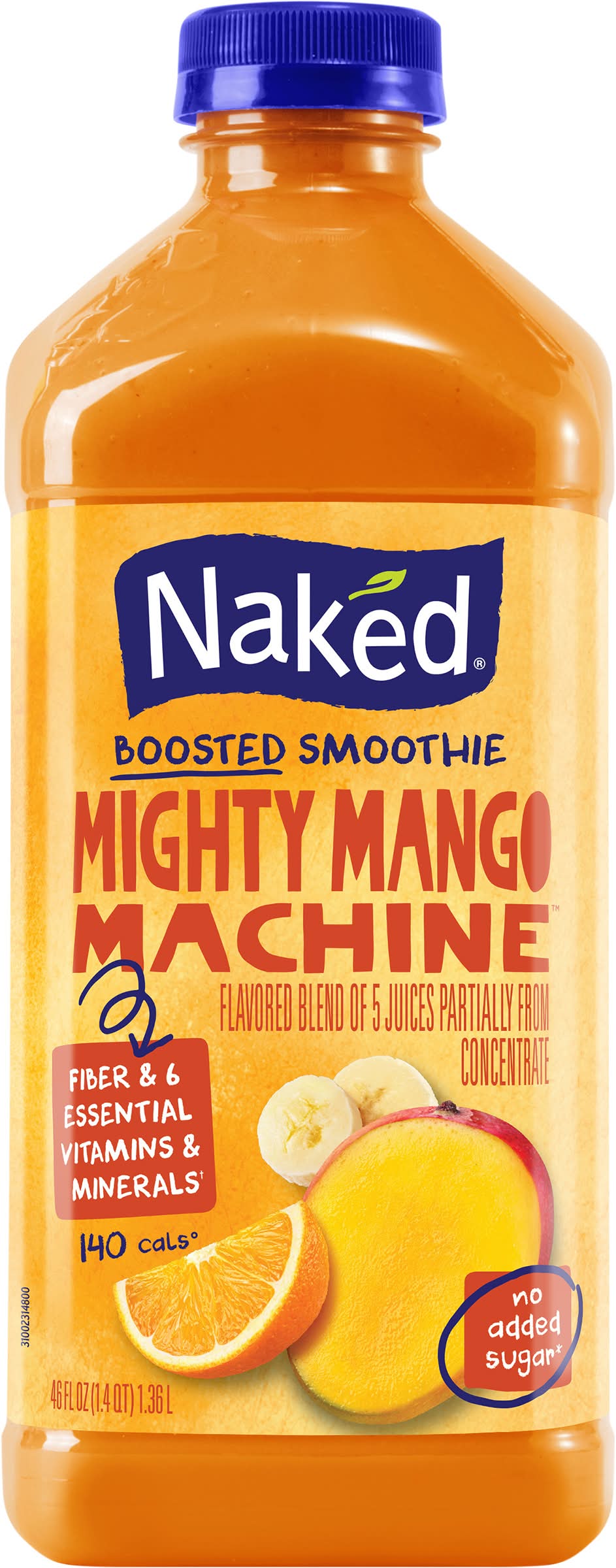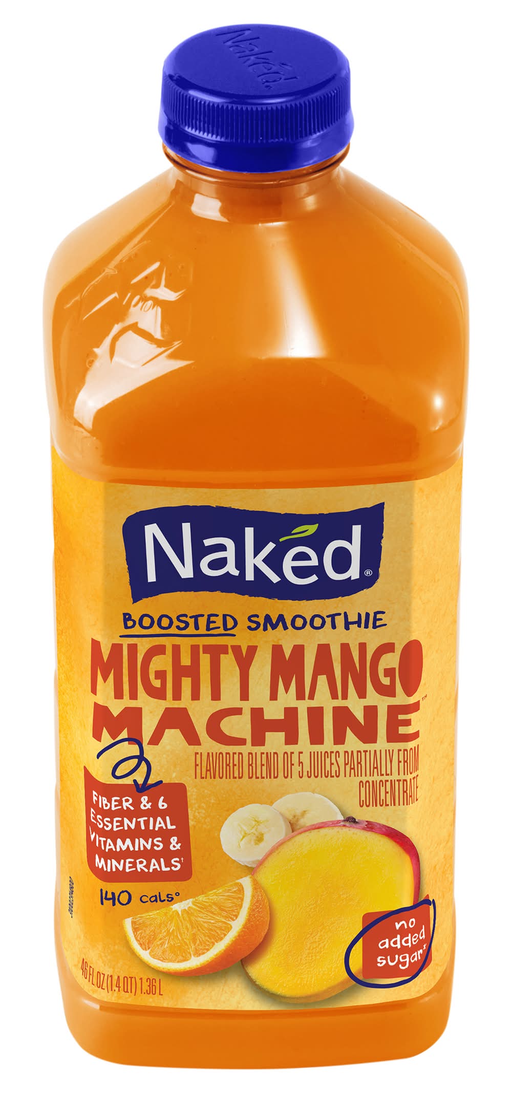 Blend of 5 Juices Partially from Concentrate with Added Ingredients & Other Natural Flavors The Goodness Outside The Goodness Inside No Preservatives Added No Sugar Added Not a low calorie food. See nutrition panel for information on sugar and calorie content. Gluten Free Vegan Juices from°... 3 2/3 Mangoes 5 1/3 Apples 2 Oranges 1 1/3 Bananas & a hint of lemon °Per bottle. • Flavor: Mighty mango machine • Naked Juice Co., Irvine, CA. • Packaging: Reusable