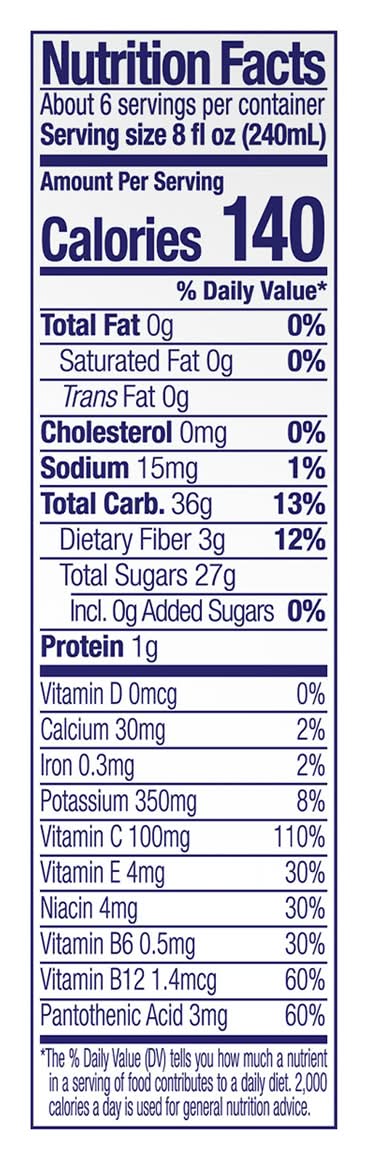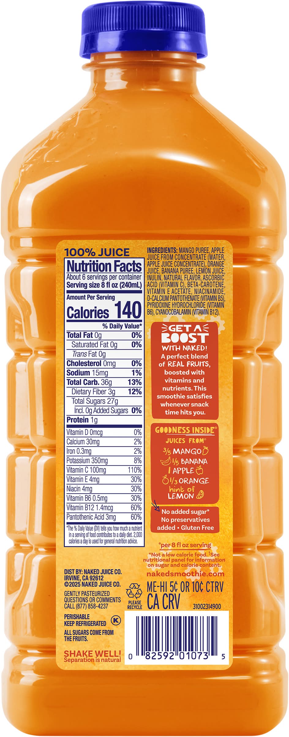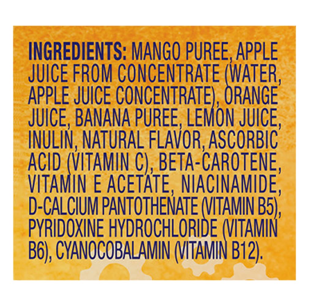 Ingredients: Mango Puree, Apple Juice from Concentrate (Water, Apple Juice Concentrate), Orange Juice, Banana Puree, Lemon Juice, Inulin, Natural Flavor, Ascorbic Acid (Vitamin C), Beta-Carotene, Vitamin E Acetate, Niacinamide, D-Calcium Pantothenate (Vitamin B5), Pyridoxine Hydrochloride (Vitamin B6), Cyanocobalamin (Vitamin B12)