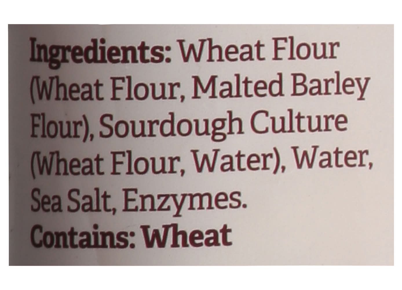 Ingredients: Wheat Flour (Wheat Flour, Malted Barley Flour), Sourdough Culture (Wheat Flour, Water), Water, Sea Salt, Enzymes Contains: Wheat, Barley