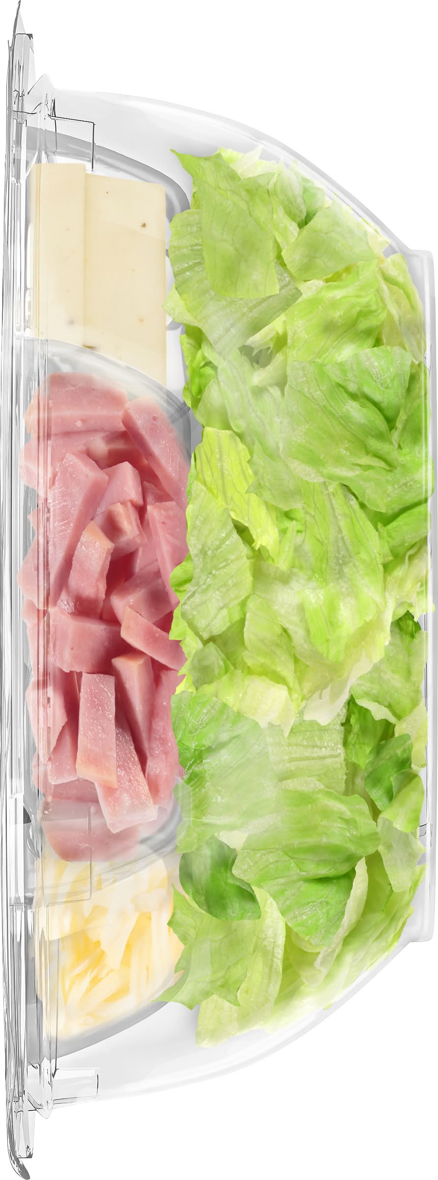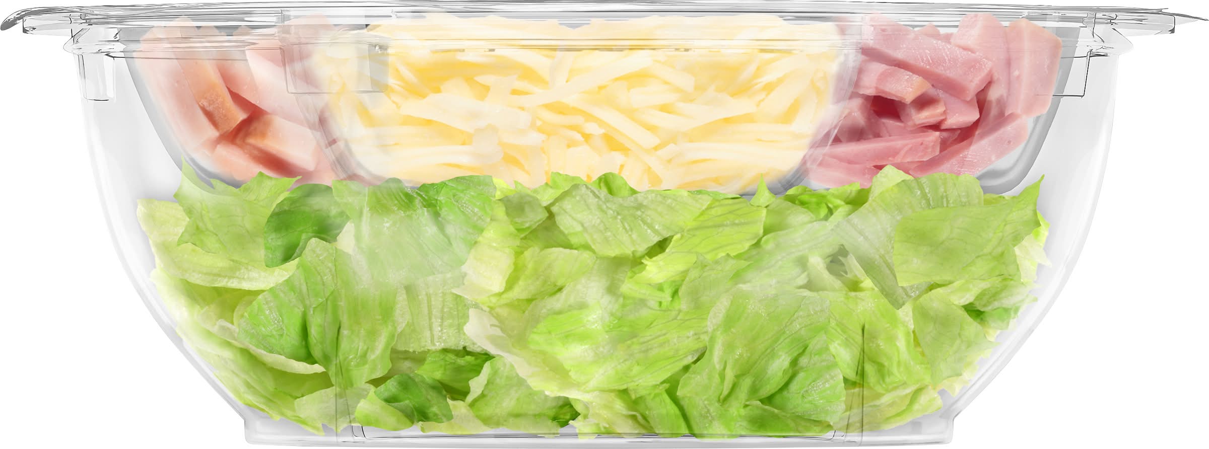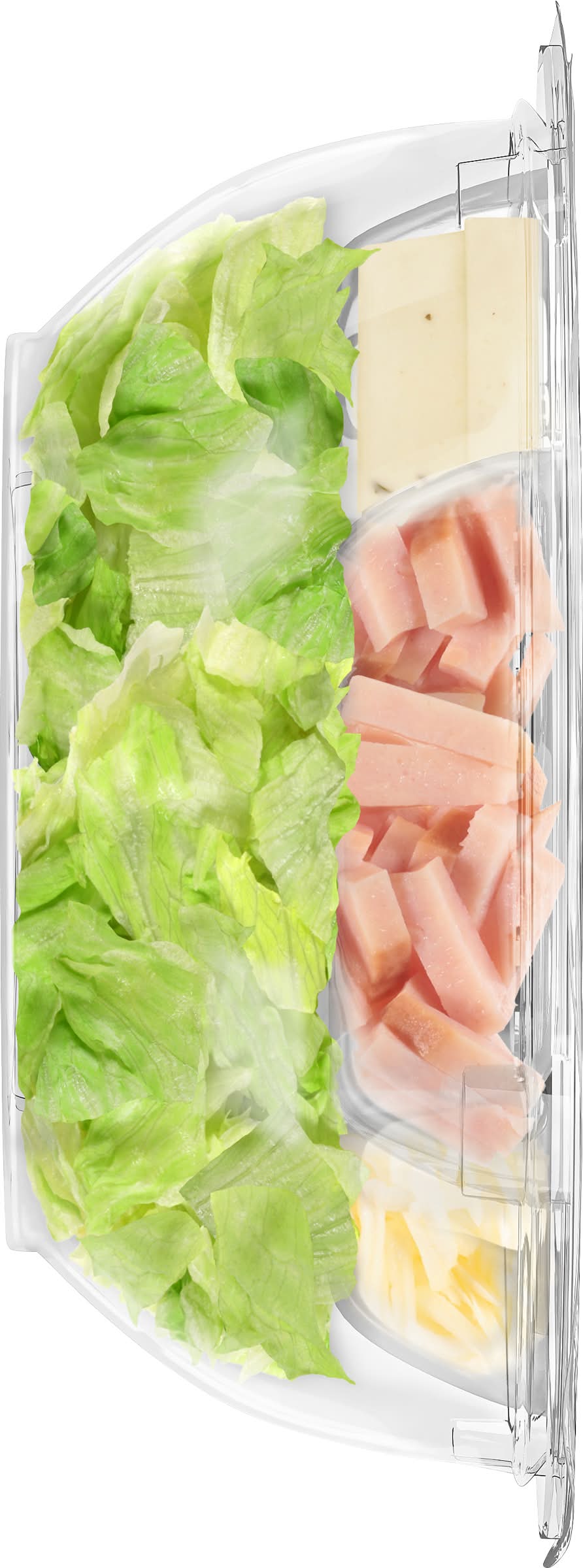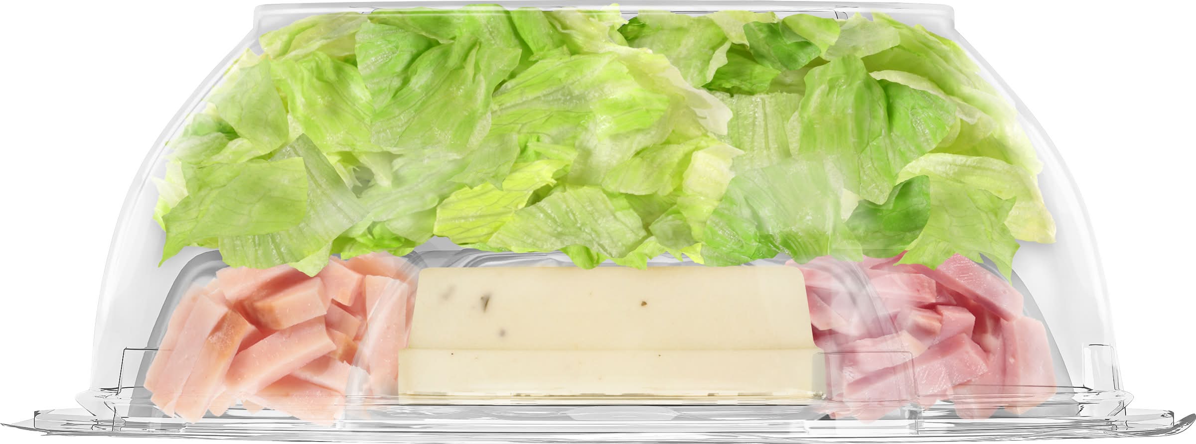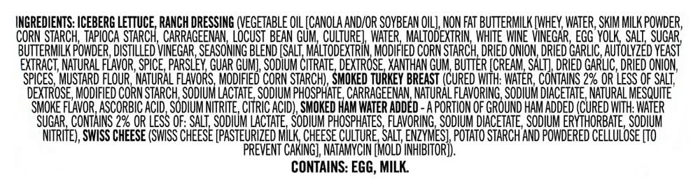 Ingredients: Iceberg Lettuce, Ranch Dressing (Vegetable Oil [Canola and/or Soybean Oil], Non Fat Buttermilk [Whey, Water, Skim Milk Powder, Corn Starch, Tapioca Starch, Carrageenan, Locust Bean Gum, Culture], Water, Maltodextrin, White Wine Vinegar, Egg Yolk, Salt, Sugar, Buttermilk Powder, Distilled Vinegar, Seasoning Blend [Salt, Maltodextrin, Modified Corn Starch, Dried Onion, Dried Garlic, Autolyzed Yeast Extract, Natural Flavor, Spice, Parsley, Guar Gum), Sodium Citrate, Dextrose, Xanthan Gum, Butter [Cream, Salt], Dried Garlic, Dried Onion, Spices, Mustard Flour, Natural Flavors, Modified Corn Starch), Smoked Turkey Breast (Cured with: Water, Contains 2% or Less of Salt, Dextrose, Modified Corn Starch, Sodium Lactate, Sodium Phosphate, Carrageenan, Natural Flavoring, Sodium Diacetate, Natural Mesquite Smoke Flavor, Ascorbic Acid, Sodium Nitrite, Citric Acid), Smoked Ham Water Added - a Portion of Ground Ham Added (Cured with: Water, Sugar, Contains 2% or Less of: Salt, Sodium Lactate, Sodium Phosphates, Flavoring, Sodium Diacetate, Sodium Erythorbate, Sodium, Nitrite), Swiss Cheese (Swiss Cheese [Pasteurized Milk, Cheese Culture, Salt, Enzymes], Potato Starch and Powdered Cellulose [to Prevent Caking], Natamycin [Mold Inhibitor]) Contains: Milk, Eggs, Corn, Mustard