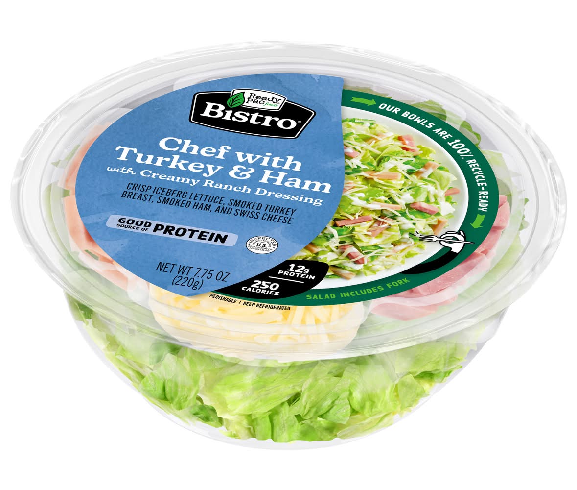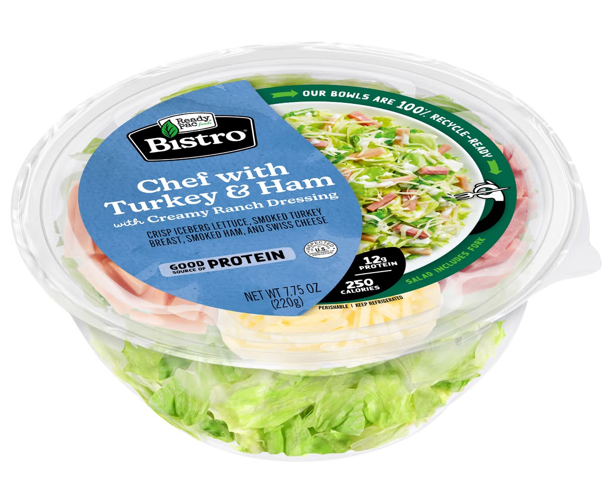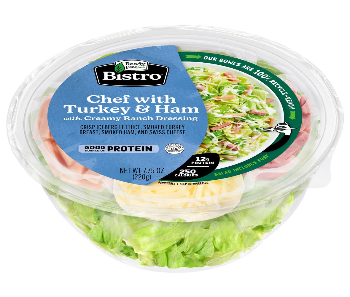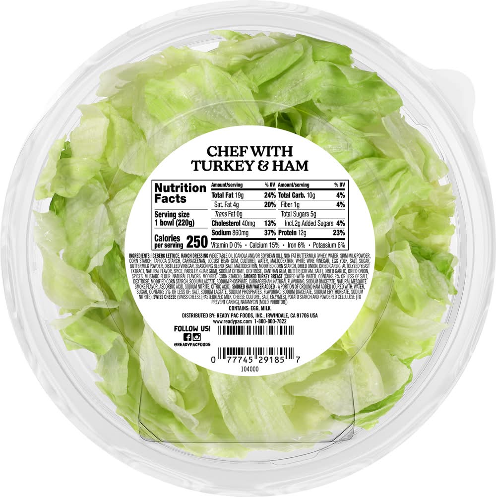 Ingredients: Iceberg Lettuce, Ranch Dressing (Vegetable Oil [Canola and/or Soybean Oil], Non Fat Buttermilk [Whey, Water, Skim Milk Powder, Corn Starch, Tapioca Starch, Carrageenan, Locust Bean Gum, Culture], Water, Maltodextrin, White Wine Vinegar, Egg Yolk, Salt, Sugar, Buttermilk Powder, Distilled Vinegar, Seasoning Blend [Salt, Maltodextrin, Modified Corn Starch, Dried Onion, Dried Garlic, Autolyzed Yeast Extract, Natural Flavor, Spice, Parsley, Guar Gum), Sodium Citrate, Dextrose, Xanthan Gum, Butter [Cream, Salt], Dried Garlic, Dried Onion, Spices, Mustard Flour, Natural Flavors, Modified Corn Starch), Smoked Turkey Breast (Cured with: Water, Contains 2% or Less of Salt, Dextrose, Modified Corn Starch, Sodium Lactate, Sodium Phosphate, Carrageenan, Natural Flavoring, Sodium Diacetate, Natural Mesquite Smoke Flavor, Ascorbic Acid, Sodium Nitrite, Citric Acid), Smoked Ham Water Added - a Portion of Ground Ham Added (Cured with: Water, Sugar, Contains 2% or Less of: Salt, Sodium Lactate, Sodium Phosphates, Flavoring, Sodium Diacetate, Sodium Erythorbate, Sodium, Nitrite), Swiss Cheese (Swiss Cheese [Pasteurized Milk, Cheese Culture, Salt, Enzymes], Potato Starch and Powdered Cellulose [to Prevent Caking], Natamycin [Mold Inhibitor]) Contains: Milk, Eggs, Corn, Mustard
