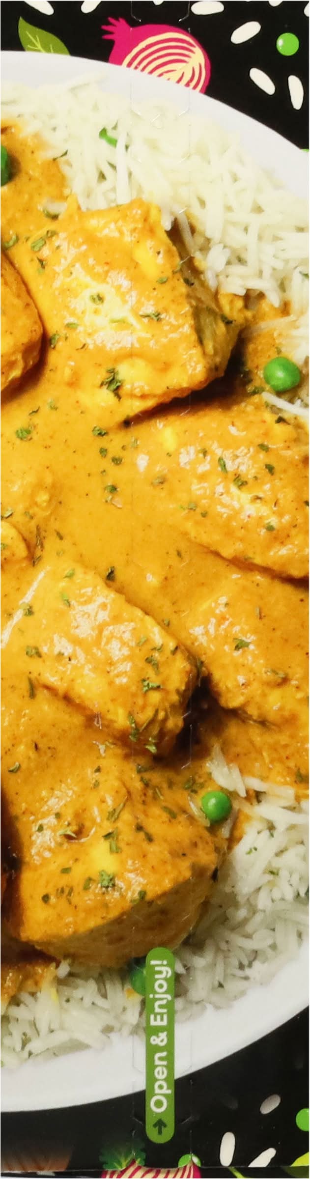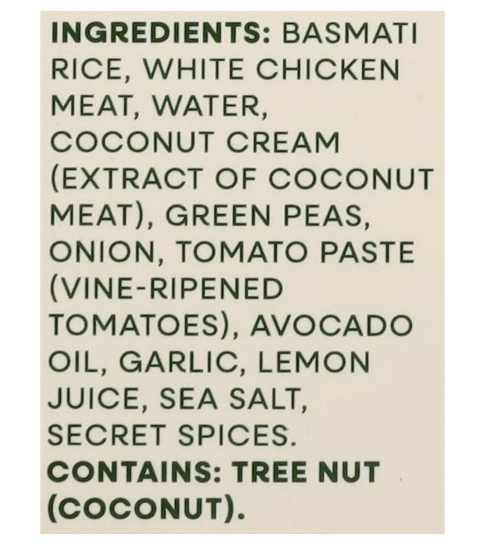 Ingredients: Basmati Rice, White Chicken Meat, Water, Coconut Cream (Extract of Coconut Meat), Green Peas, Onion, Tomato Paste (Vine-Ripened Tomatoes), Avocado Oil, Garlic, Lemon Juice, Sea Salt, Secret Spices Contains: Tree Nuts, Coconuts