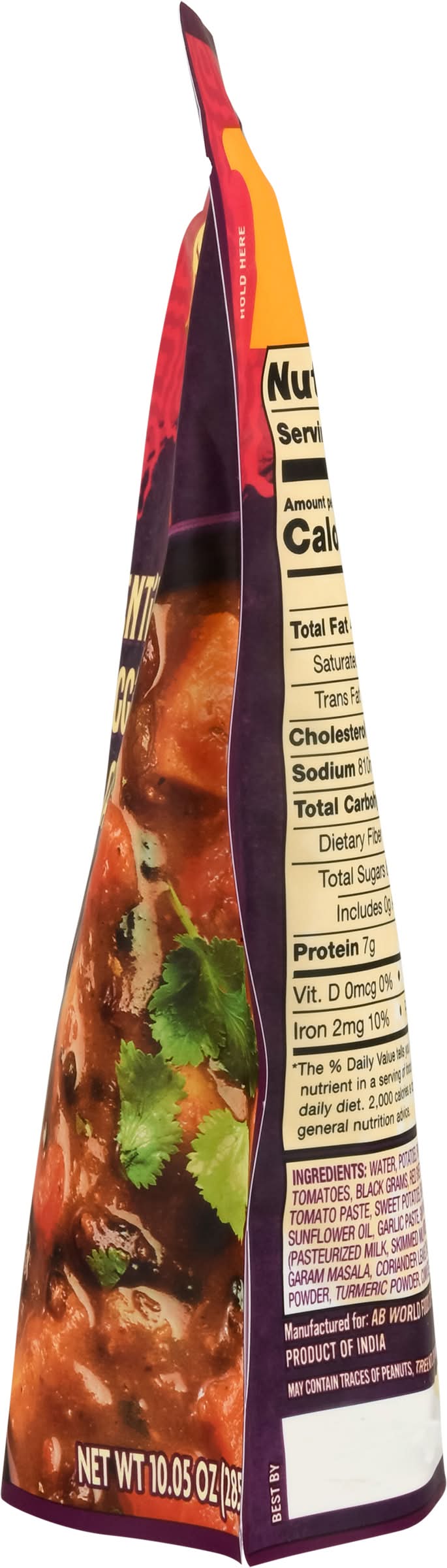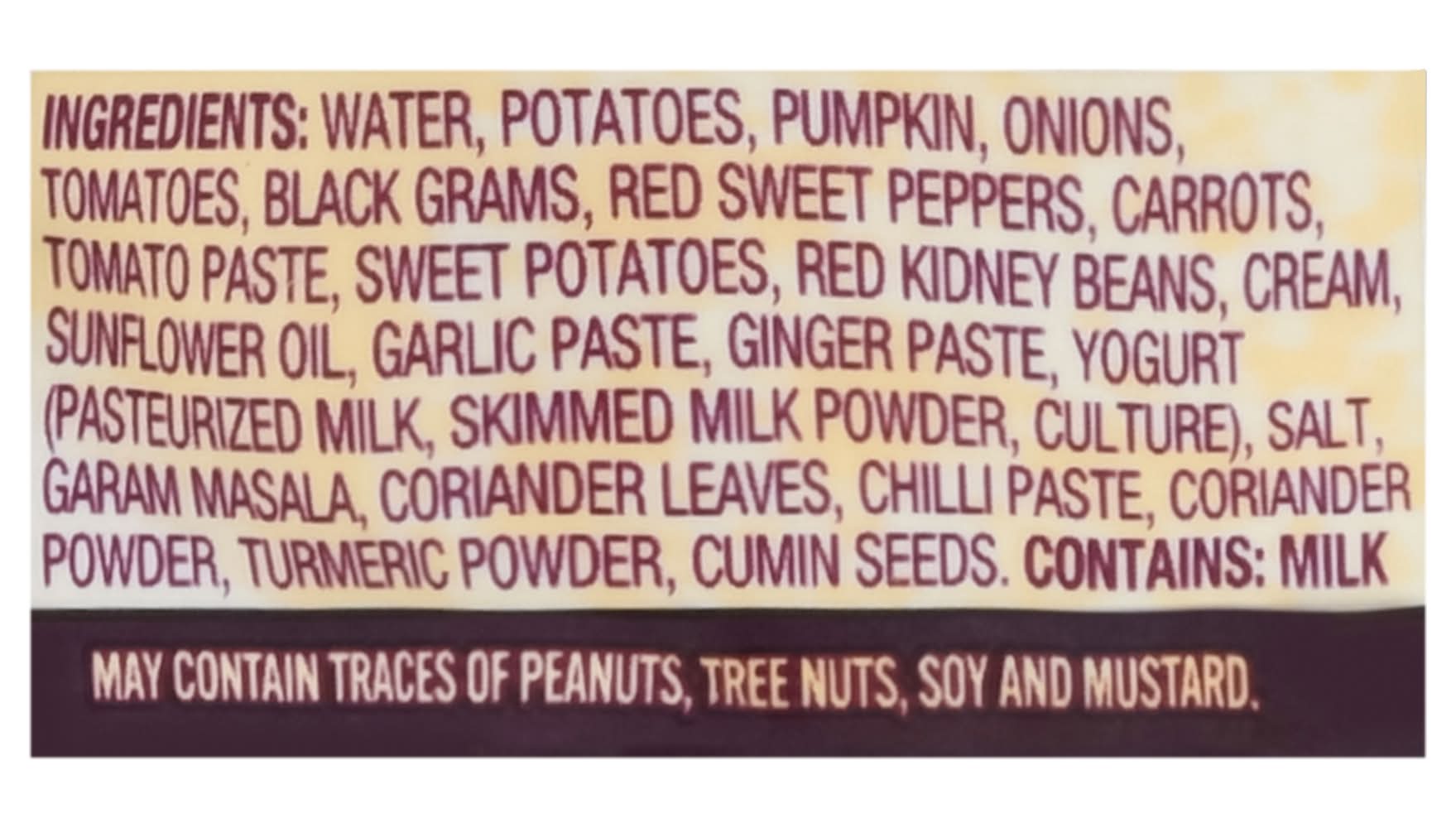 Ingredients: Water, Potatoes, Pumpkin, Onions, Tomatoes, Black Grams, Red Sweet Peppers, Carrots, Tomato Paste, Sweet Potatoes, Red Kidney Beans, Cream, Sunflower Oil, Garlic Paste, Ginger Paste, Yogurt (Pasteurized Milk, Skimmed Milk Powder, Culture), Salt, Garam Masala, Coriander Leaves, Chilli Paste, Coriander Powder, Turmeric Powder, Cumin Seeds Contains: Milk, Peanuts, Tree Nuts, Soybeans, Mustard