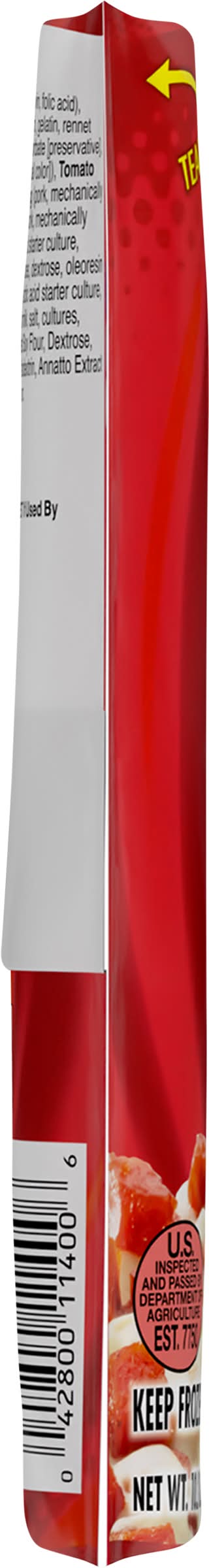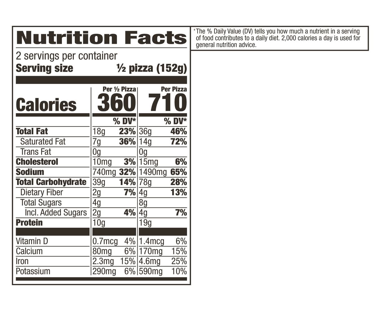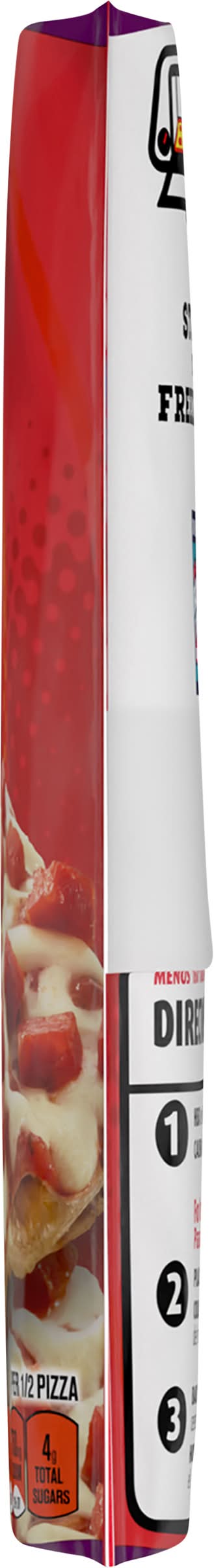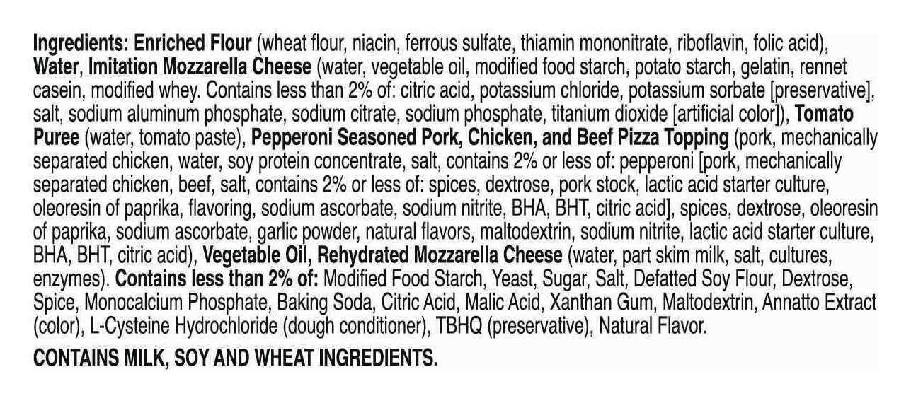 Ingredients: Enriched Flour (Wheat Flour, Niacin, Ferrous Sulfate, Thiamin Mononitrate, Riboflavin, Folic Acid), Water, Imitation Mozzarella Cheese (Water, Vegetable Oil, Modified Food Starch, Potato Starch, Gelatin, Rennet Casein, Modified Whey, Contains Less than 2% of: Citric Acid, Potassium Chloride, Potassium Sorbate [Preservative], Salt, Sodium Aluminum Phosphate, Sodium Citrate, Sodium Phosphate, Titanium Dioxide [Artificial Color]), Tomato Puree (Water, Tomato Paste), Pepperoni Seasoned Pork, Chicken, and Beef Pizza Topping (Pork, Mechanically Separated Chicken, Water, Soy Protein Concentrate, Salt, Contains 2% or Less of: Pepperoni [Pork, Mechanically Separated Chicken, Beef, Salt, Contains 2% or Less of: Spices, Dextrose, Pork Stock, Lactic Acid Starter Culture, Oleoresin of Paprika, Flavoring, Sodium Ascorbate, Sodium Nitrite, BHA, BHT, Citric Acid], Spices, Dextrose, Oleoresin of Paprika, Sodium Ascorbate, Garlic Powder, Natural Flavors, Maltodextrin, Sodium Nitrite, Lactic Acid Starter Culture, BHA, BHT, Citric Acid), Vegetable Oil, Rehydrated Mozzarella Cheese (Water, Part Skim Milk, Salt, Cultures, Enzymes), Contains Less than 2% of: Modified Food Starch, Yeast, Sugar, Salt, Defatted Soy Flour, Dextrose, Spice, Monocalcium Phosphate, Baking Soda, Citric Acid, Malic Acid, Xanthan Gum, Maltodextrin, Annatto Extract (Color), L-Cysteine Hydrochloride (Dough Conditioner), TBHQ (Preservative), Natural Flavor Contains: Milk, Soybeans, Wheat
