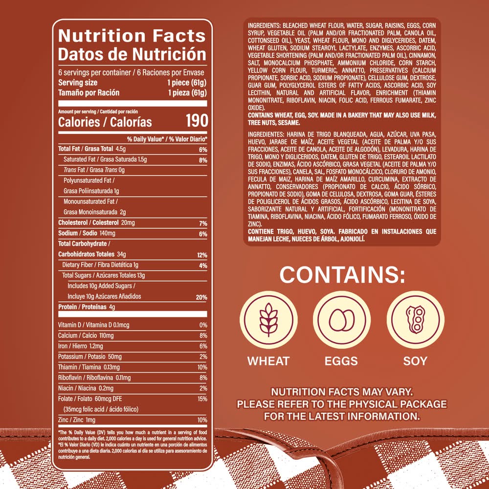 Ingredients: BLEACHED WHEAT FLOUR, WATER, SUGAR, RAISINS, EGGS, CORN SYRUP, VEGETABLE OIL [PALM AND/OR FRACTIONATED PALM, CANOLA OIL, COTTONSEED OIL], YEAST, WHEAT FLOUR, MONO AND DIGLYCERIDES, DATEM, WHEAT GLUTEN, SODIUM STEAROYL LACTYLATE, ENZMYES, ASCORBIC ACID, VEGETABLE SHORTENING [PALM AND/OR FRACTIONATED PALM OIL], CINNAMON, SALT, MONOCALCIUM PHOSPHATE, AMMONIUM CHLORIDE, CORN STARCH, YELLOW CORN FLOUR, TURMERIC, ANNATTO, PRESERVATIVES [CALCIUM PROPIONATE, SORBIC ACID, SODIUM PROPIONATE], CELLULOSE GUM, DEXTROSE, GUAR GUM, POLYGLYCEROL ESTERS OF FATTY ACIDS, ASCORBIC ACID, SOY LECITHIN, NATURAL AND ARTIFICIAL FLAVOR, ENRICHMENT [THIAMIN MONONITRATE, RIBOFLAVIN, NIACIN, FOLIC ACID, FERROUS FUMARATE, ZINC OXIDE], . Contains: CONTAINS EGG, SOY, WHEAT.