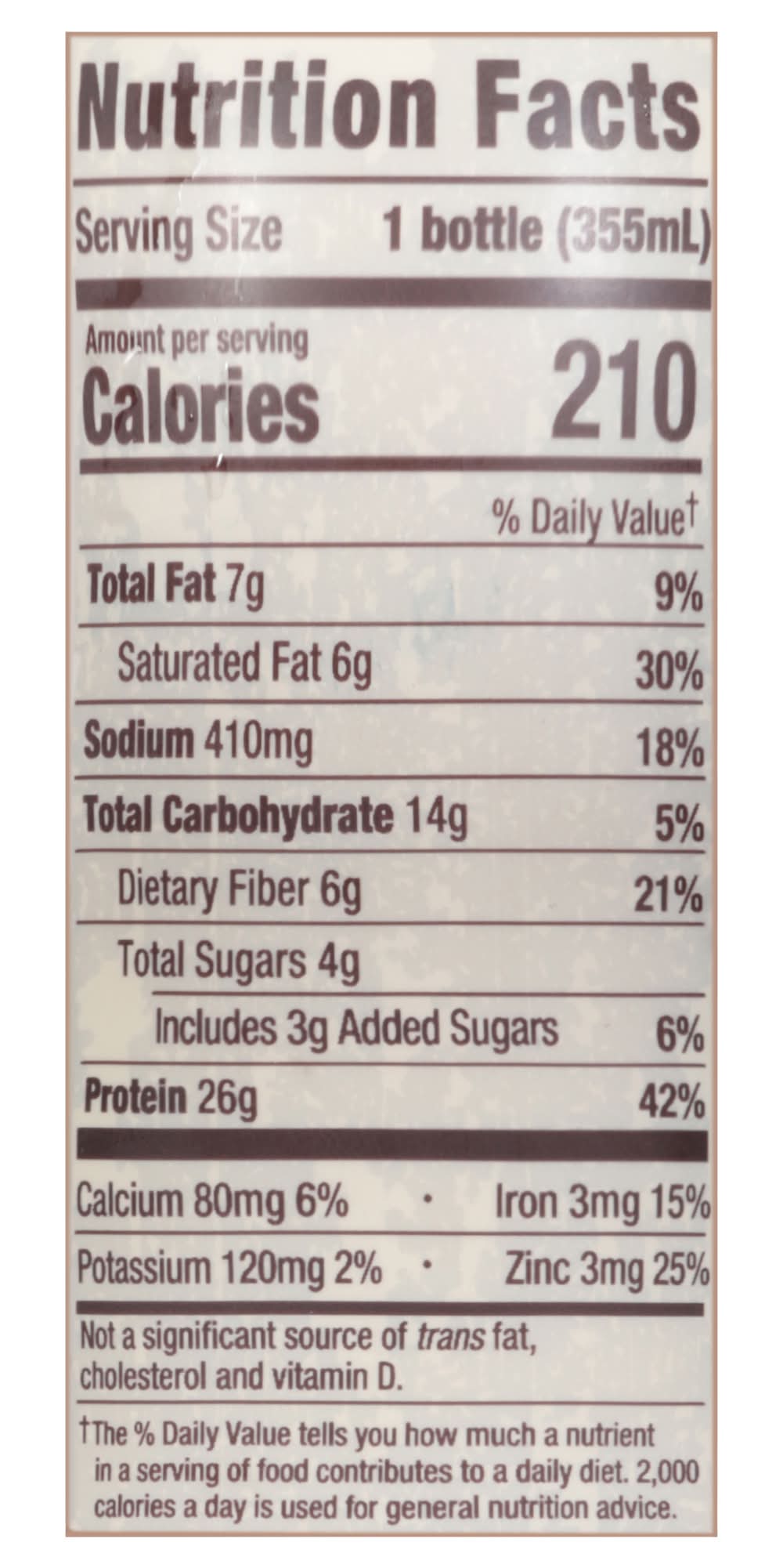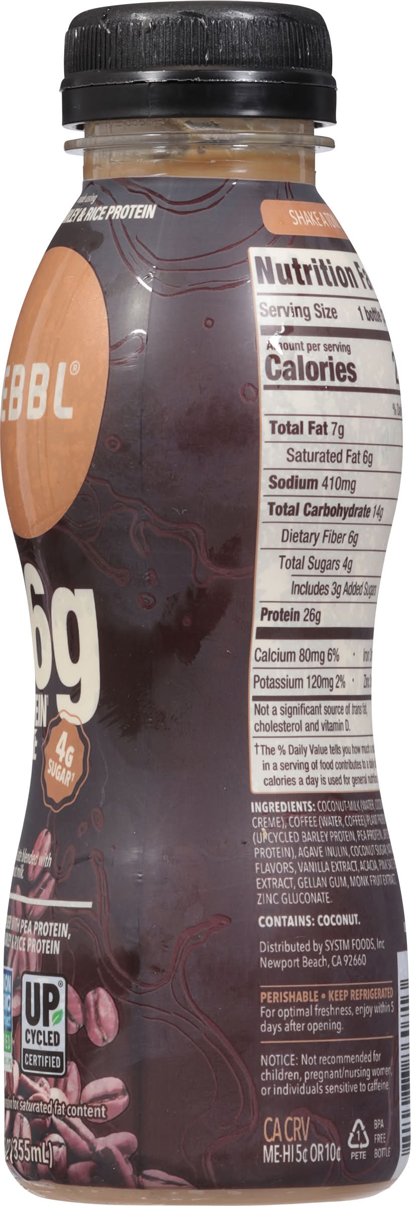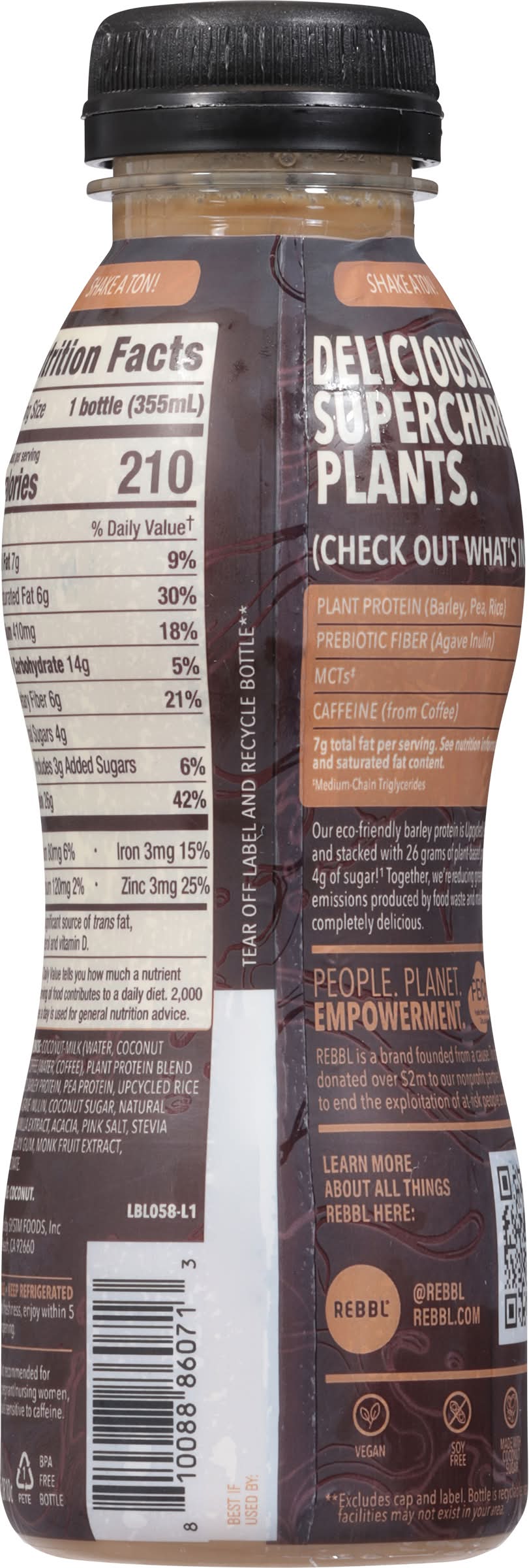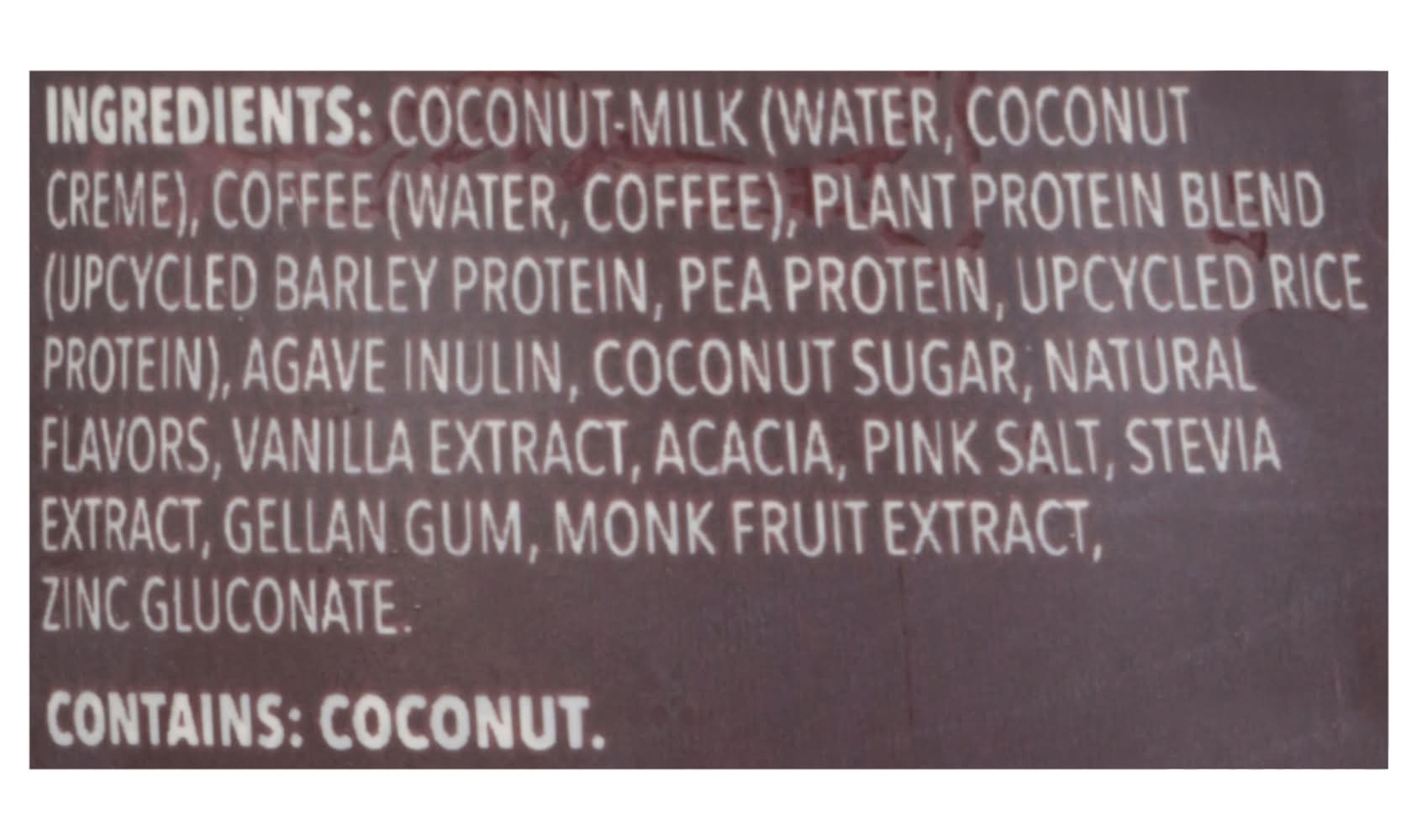 Ingredients: Coconut-Milk (Water, Coconut Creme), Coffee (Water, Coffee), Plant Protein Blend (Upcycled Barley Protein, Pea Protein, Upcycled Rice Protein), Agave Inulin, Coconut Sugar, Natural Flavors, Vanilla Extract, Acacia, Pink Salt, Stevia Extract, Gellan Gum, Monk Fruit Extract, Zinc Gluconate Contains: Tree Nuts, Coconuts, Milk, Barley