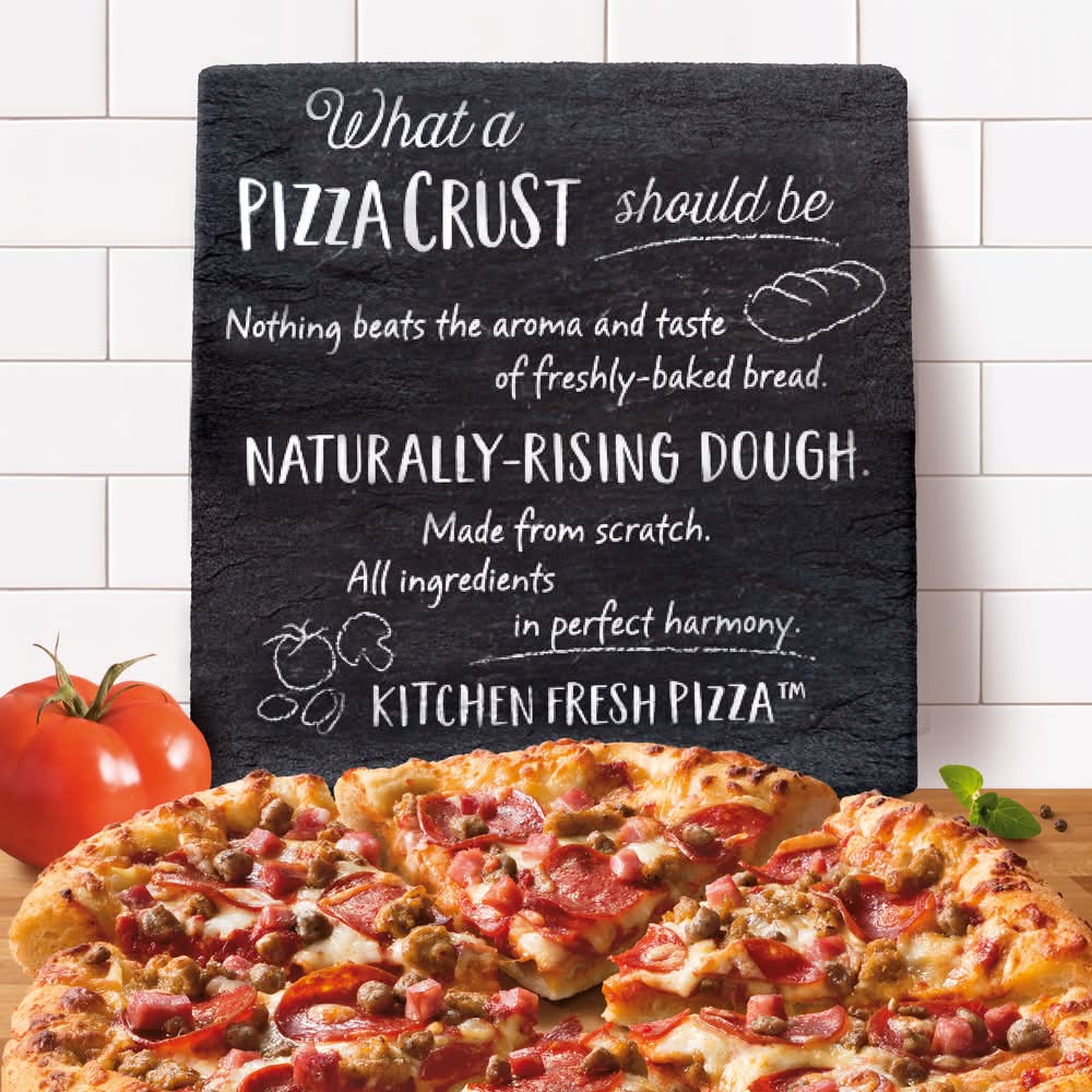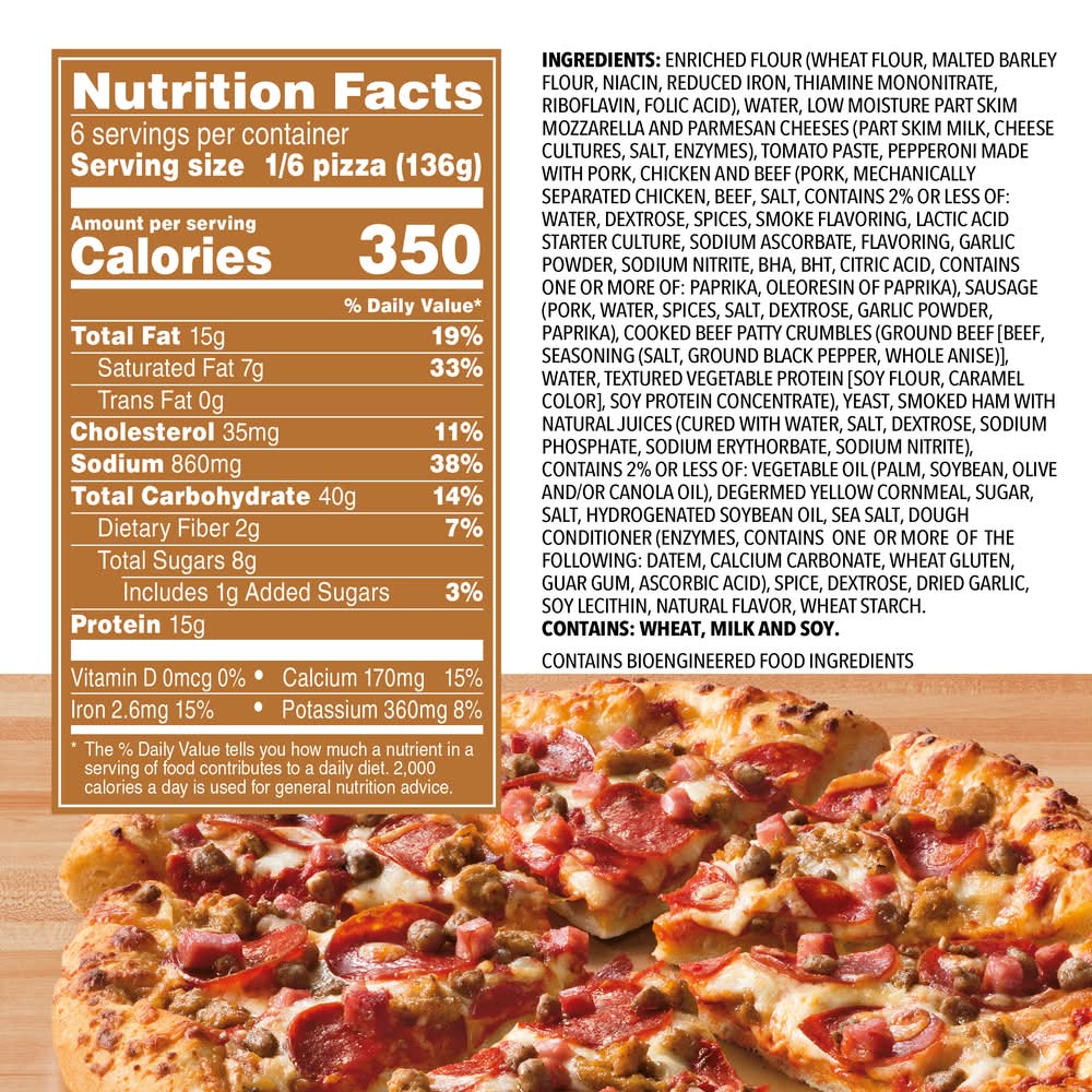 Ingredients: INGREDIENTS: ENRICHED FLOUR (WHEAT FLOUR, MALTED BARLEY FLOUR, NIACIN, REDUCED IRON, THIAMINE MONONITRATE, RIBOFLAVIN, FOLIC ACID), WATER, LOW MOISTURE PART SKIM MOZZARELLA AND PARMESAN CHEESES (PART SKIM MILK, CHEESE CULTURES, SALT, ENZYMES), TOMATO PASTE, PEPPERONI MADE WITH PORK, CHICKEN AND BEEF (PORK, MECHANICALLY SEPARATED CHICKEN, BEEF, SALT, CONTAINS 2% OR LESS OF: DEXTROSE, LACTIC ACID STARTER CULTURE, FLAVORING, SODIUM NITRITE, BHA, BHT, CITRIC ACID. MAY ALSO CONTAIN: SPICES, WATER, PAPRIKA, OLEORESIN OF PAPRIKA, SPICE EXTRACTIVES, SMOKE FLAVORING, SODIUM ASCORBATE, ASCORBIC ACID, BEEF STOCK), SAUSAGE (PORK, WATER, SPICES, SALT, DEXTROSE, GARLIC POWDER, PAPRIKA), COOKED BEEF PATTY CRUMBLES (GROUND BEEF [BEEF, SEASONING (SALT, GROUND BLACK PEPPER, WHOLE ANISE)], WATER, TEXTURED VEGETABLE PROTEIN [SOY FLOUR, CARAMEL COLOR], SOY PROTEIN CONCENTRATE), YEAST, SMOKED HAM WITH NATURAL JUICES (CURED WITH WATER, SALT, DEXTROSE, SODIUM PHOSPHATE, SODIUM ERYTHORBATE, SODIUM NITRITE), CONTAINS 2% OR LESS OF: VEGETABLE OIL (PALM, SOYBEAN, OLIVE AND/OR CANOLA OIL), DEGERMED YELLOW CORNMEAL, SUGAR, SALT, HYDROGENATED SOYBEAN OIL, SEA SALT, DOUGH CONDITIONER (ENZYMES, CONTAINS ONE OR MORE OF THE FOLLOWING: DATEM, CALCIUM CARBONATE, WHEAT GLUTEN, GUAR GUM, ASCORBIC ACID), SPICE, DEXTROSE, DRIED GARLIC, SOY LECITHIN, NATURAL FLAVOR, WHEAT STARCH. Contains: Milk, Wheat, Soy