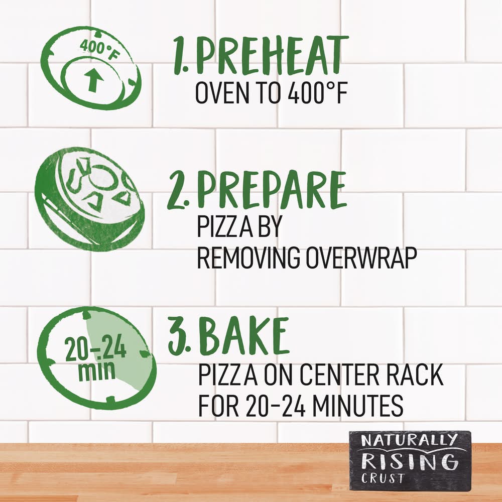 Directions for use: 1. Preheat: Preheat oven to 400 degrees F. 2. Prepare: Remove pizza from box & overwrap, and place on pan. 3. Bake: Bake on a pan on center rack for 20-24 minutes or until cheese is melted at the center & crust is golden brown. Don't Forget: Keep pizza frozen while preheating. Do not thaw pizza. For food safety and quality, cook until the internal temperature is 160 degrees F before eating. Cook thoroughly before eating. Cooking times may vary. Let cool for at least 2 minutes. Refrigerate or discard any unused portion. Keep frozen, cook as directed. Storage recommendation: Keep frozen, cook as directed.